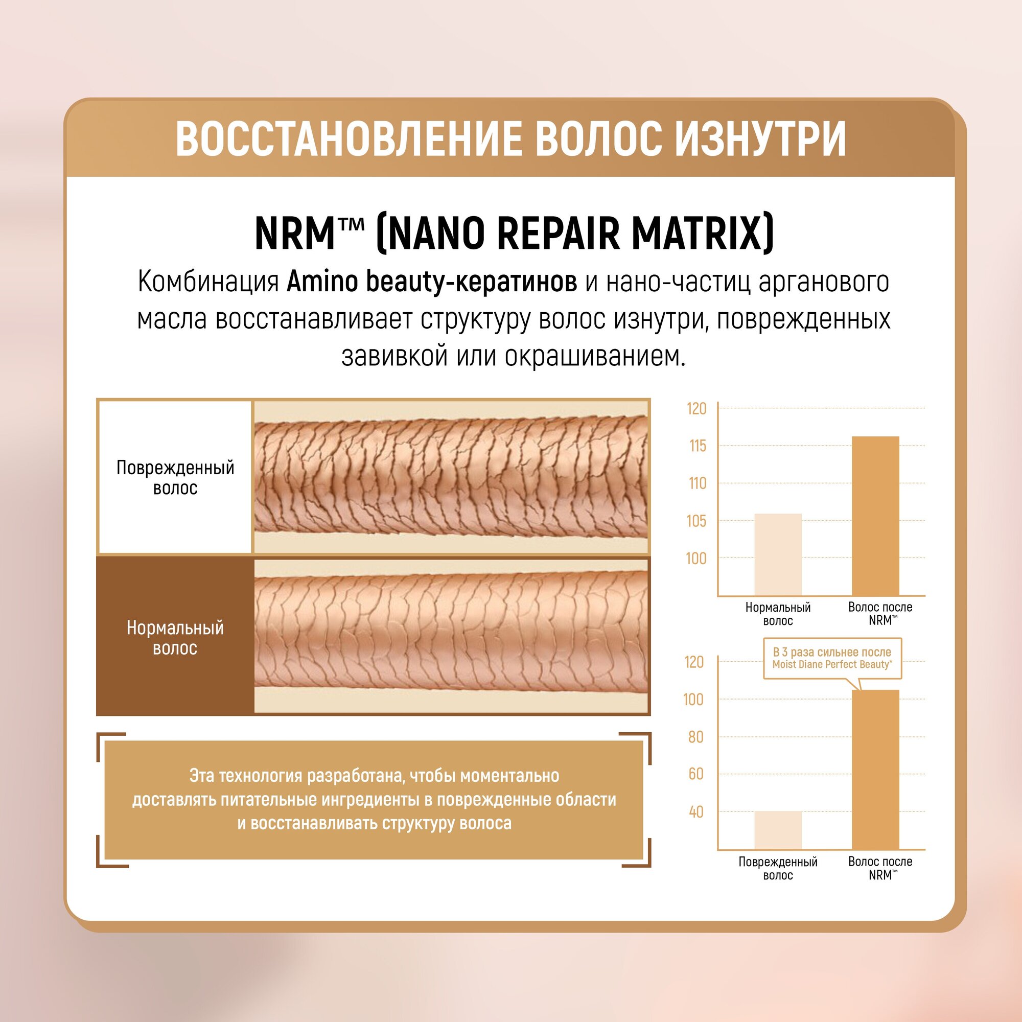 NRM™ (Nano Repair Matrix) - комбинация Amino beauty-кератинов и нано-частиц арганового масла восстанавливает структуру волос изнутри, поврежденных завивкой или окрашиванием. Без сульфатов.