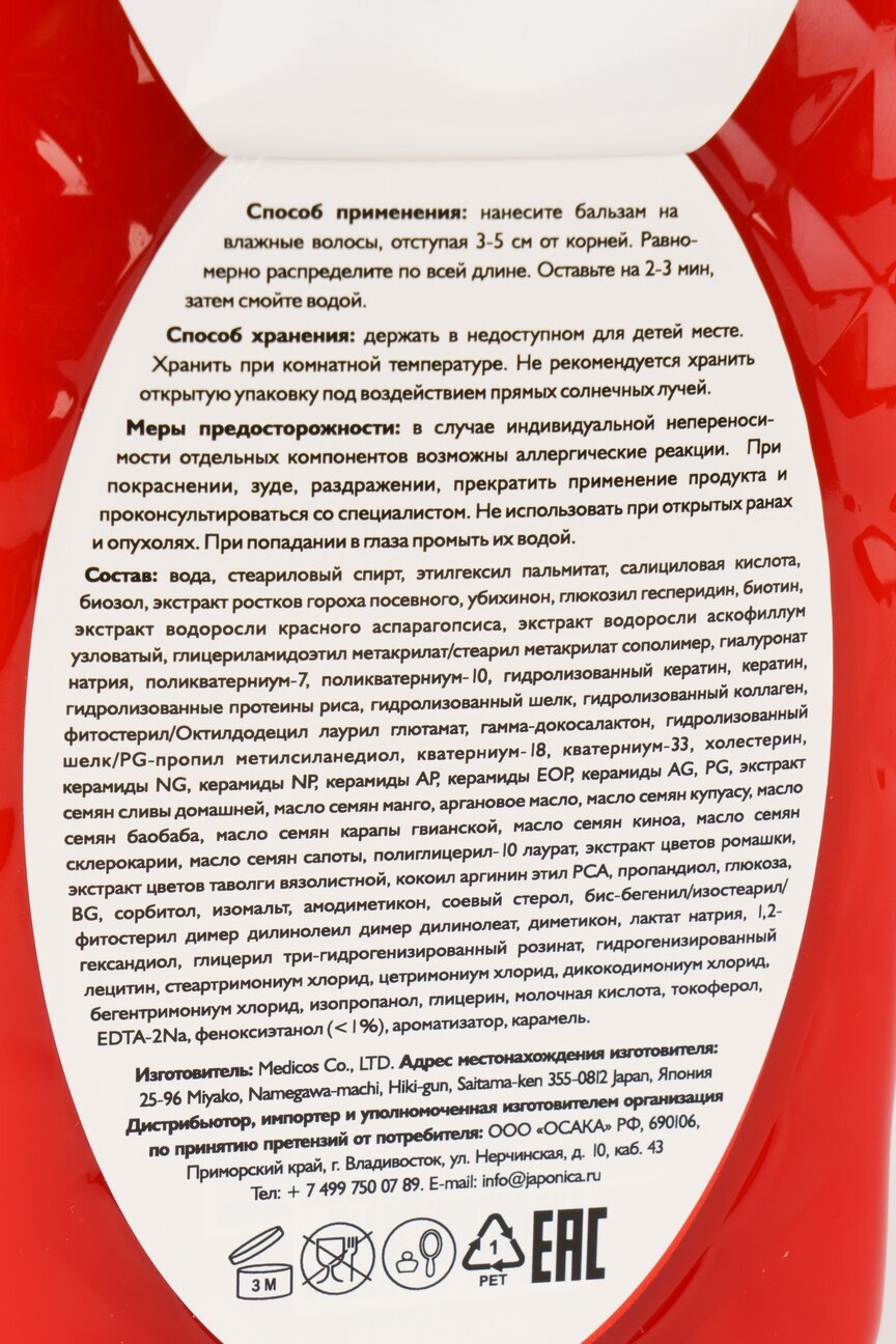Состав: Вода, стеариловый спирт, этилгексил пальмитат, салициловая кислота, биозол, экстракт ростков гороха посевного, убихинон, глюкозил гесперидин, биотин, экстракт водоросли красного аспарагопсиса, экстракт водоросли аскофиллум узловатый, глицериламидоэтил метакрилат/стеарил метакрилат сополимер, гиалуронат натрия, поликватерниум-7, поликватерниум-10, гидролизованный кератин, кератин, гидролизованные протеины риса, гидролизованный шелк, гидролизованный коллаген, фитостерил/ Октилдодецил лаурил глютамат, гамма-докосалактон, гидролизованный шелк /PG-пропил метилсиланедиол, кватерниум-18, кватерниум-33, холестерин, керамиды NG, керамиды NP, керамиды AP, керамиды EOP, керамиды AG, PG, экстракт семян сливы домашней, масло семян манго, аргановое масло, масло семян купуасу, масло семян баобаба, масло семян карапы гвианской, масло семян киноа, масло семян склерокарии, масло семян сапоты, полиглицерил-10 лаурат, экстракт цветов ромашки, экстракт цветов таволги вязолистной, кокоил аргинин этил PCA, пропандиол, глюкоза, BG, сорбитол, изомальт, амодиметикон, соевый стерол, бис-бегенил/изостеарил/фитостерил димер дилинолеил димер дилинолеат, диметикон, лактат натрия, 1,2-гександиол, глицерил три-гидрогенизированный розинат, гидрогенизированный лецитин, стеартримониум хлорид, цетримониум хлорид, дикокодимониум хлорид, бегентримониум хлорид, изопропанол, глицерин, молочная кислота, токоферол, EDTA-2Na, феноксиэтанол (