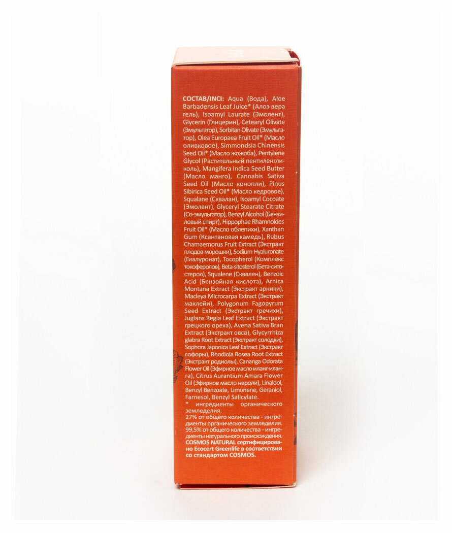 Состав: aqua (вода), aloe barbadensis leaf juice (алоэ вера гель), cannabis sativa seed oil (масло конопли), glycerin (глицерин), cetearyl olivate (эмульгатор), sorbitan olivate (эмульгатор), simmondsia chinensis seed oil (масло жожоба), rosa canina fruit oil (масло шиповника), olea europaea fruit oil (масло оливковое), squalane (сквалан), pinus sibirica seed oil (масло кедровое), pentylene glycol (растительный пентиленгликоль), linum usitatissimum (linseed) seed oil (масло льняное), glyceryl stearate citrate (со-эмульгатор), benzyl alcohol (бензиловый спирт), xanthan gum (ксантановая камедь), rubus chamaemorus fruit extract (экстракт морошки), sodium hyaluronate (гиалуронат), benzoic acid (бензойная кислота), tocopherol (комплекс токоферолов), beta-sitosterol (бета-ситостерол), squalene (сквален), camellia sinensis leaf extract (экстракт зеленого чая), macleya microcarpa extract (экстракт маклейи), juglans regia leaf extract (экстракт грецкого ореха), petroselinum crispum seed extract (экстракт петрушки), foeniculum vulgare seed extract (экстракт фенхеля), ginkgo biloba leaf extract (экстракт гинкго-билоба), eleutherococcus senticosus root extract (экстракт элеутерококка), equisetum arvense extract (экстракт хвоща), cananga odorata oil (эфирное масло иланг-иланг), citrus aurantium amara flower oil (эфирное масло нероли), linalool, benzyl benzoate, limonene, geraniol, benzyl salicylate, farnesol
