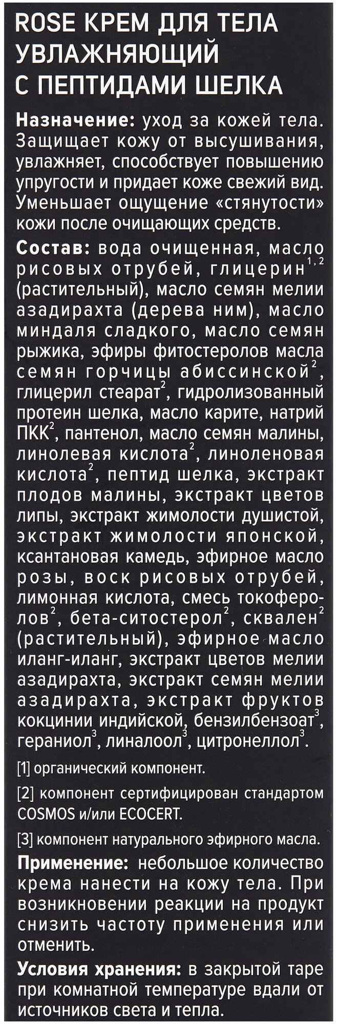 Вода очищенная, масло рисовых отрубей, глицерин (растительный), масло семян мелии азадирахта (дерева ним), масло миндаля сладкого, масло семян рыжика, эфиры фитостеролов масла семян горчицы абиссинской*, глицерил стеарат*, шёлк гидролизованный, масло ши (каритэ), натрия ПКК*, пантенол, масло семян малины, линолевая кислота*, линоленовая кислота*, пептиды протеина шёлка, экстракт плодов малины, экстракт цветов липы, экстракт жимолости душистой, экстракт жимолости японской, ксантан, эфирное масло розы, рисовый воск, лимонная кислота, смесь токоферолов*, бета-ситостерол*, сквален (растительный)*, эфирное масло иланг-иланга, экстракт цветов мелии азадирахта (дерева ним), экстракт семян мелии азадирахта (дерева ним), экстракт фруктов кокцинии индийской. *компонент сертифицирован стандартом Ecocert.