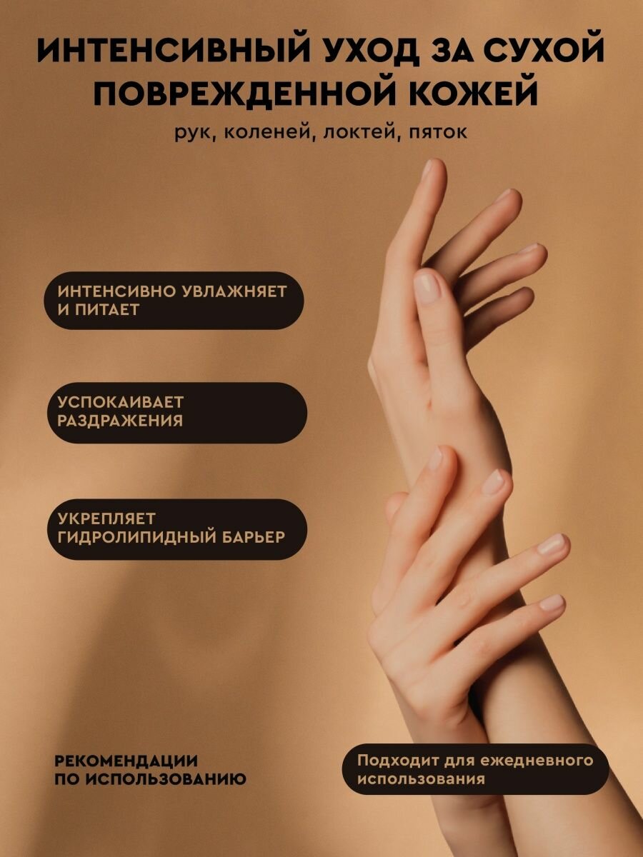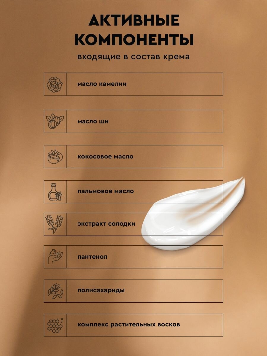 Уникальная формула крема для тела с активными природными компонентами и суперплотная сбитая текстура обеспечивают интенсивное восстановление и мгновенное питание участков кожи, требующих экстренного ухода, – рук, коленей, локтей, пяток. Базовый комплекс твердых растительных масел – ши, кокоса и пальмы, насыщающих кожу необходимыми для ее здоровья жирными кислотами, способствует регенерации клеток эпидермиса, глубокому увлажнению, устранению сухости, смягчению. Роскошное масло камелии с высоким содержанием олеиновой кислоты и витаминами А, В и Е, питает, омолаживает и восстанавливает кожу. Благодаря D-пантенолу влага удерживается в верхних слоях, гарантируя дополнительное увлажнение. Экстракт солодки благотворно влияет на состояние кожи, купируя воспалительные процессы и снимая шелушение. Рисовый воск обладает антимикробным, питательным и смягчающим действиями. Карнаубский воск в составе крема проявляет свои защитные способности, оберегая кожу от внешних воздействий, создавая комфортную среду для восстановления.Восточная композиция эфирных масел с цветочными, бальзамическими, древесными и пряными оттенками наполняет натуральный уход чувственным изысканным ароматом.