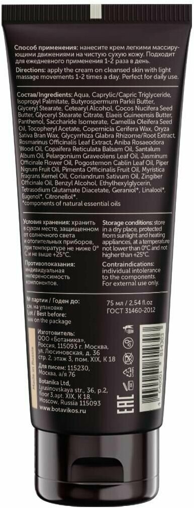 | Химический состав | Aqua, Isopropyl Palmitate, Butyrospermum Parkii Butter, Caprylic/Capric Triglyceride, Glyceryl Stearate, Cetearyl Alcohol, Cocos Nucifera Seed Butter, Elaeis Guineensis Butter, Glyceryl Stearate Citrate, Panthenol, Saccharide Isomerate, Camellia Oleifera Seed Oil, Tocopheryl Acetate, Copernicia Cerifera (Carnauba) Wax, Oryza Sativa (Rice) Bran Wax, Benzyl Alcohol, Sodium Carbomer, Ethylhexylglycerin, Glycyrrhiza Glabra Rhizome/Root Extract, Rosmarinus Officinalis Leaf Extract, Citric Acid, Aniba Rosaeodora Wood Oil, Copaifera Reticulata Balsam Oil, Santalum Album Oil, Pelargonium Roseum Leaf Oil, Jasminum Officinale Flower Oil, Pogostemon Cablin Leaf Oil, Piper Nigrum Fruit Oil, Pimenta Officinalis Fruit Oil, Myristica Fragrans Kernel Oil, Coriandrum Sativum Oil, Zingiber Officinale Oil, Linalool*, Citronellol*, Limonene*, Citral*, Geraniol*, Hexylcinnamal*, Benzyl Benzoate*, Cinnamyl Alcohol* |