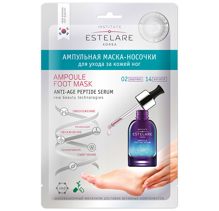 Ампульная маска-носочки - средство для профессионального и домашнего ухода за кожей ног, разработанное на основании последних исследований в области старения клеток. Изнутри носочки пропитаны концентрированной ампульной сывороткой, содержащей омолаживающий биоактивный комплекс пептидов, эластина и 14 натуральных экстрактов. Благодаря уникальному составу сыворотки формируется оздоравливающий и увлажняющий кожу защитный барьер, восстанавливается естественный баланс кожи. Использование маски 1-2 раза в неделю омолаживает и улучшает общее состояние кожи, обеспечивает увлажнение, питание и эластичность сухих участков стопы. Оказывает противовоспалительное и смягчающее действие, снимает шелушение и покраснение, защищает от неблагоприятного воздействия окружающей среды и возрастных изменений. При регулярном использовании маски ноги выглядят молодо и ухожено!