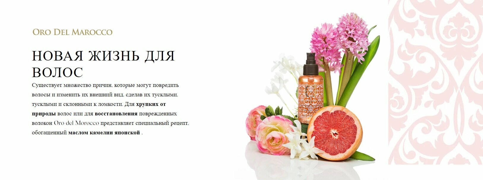 | Применение | после использования «питательного шампуня» серии Oro del Marocco нанести на влажные волосы от корней до кончиков, оставить для воздействия на 1-2 минуты, после чего смыть большим количеством воды |