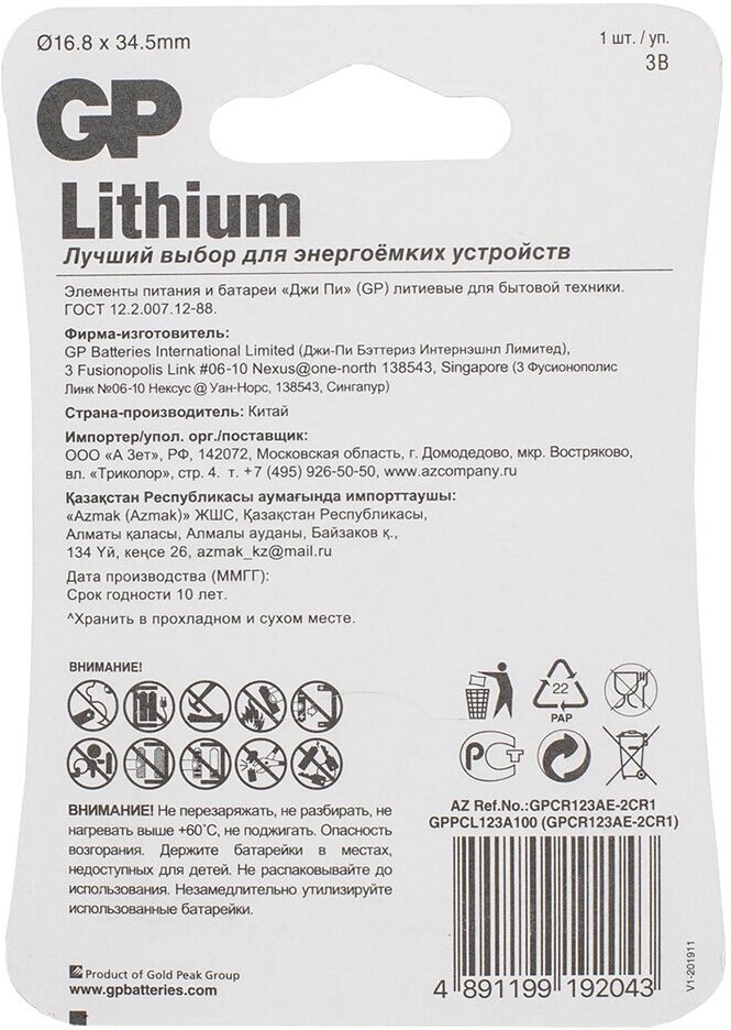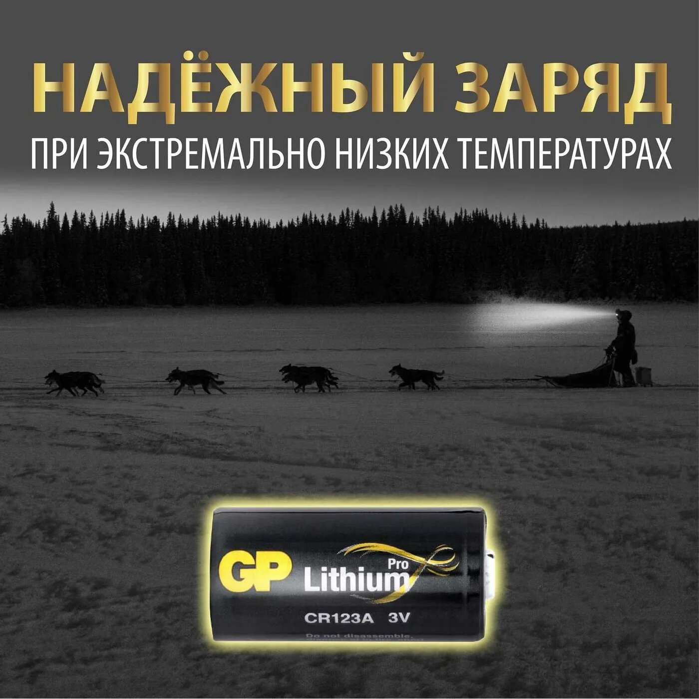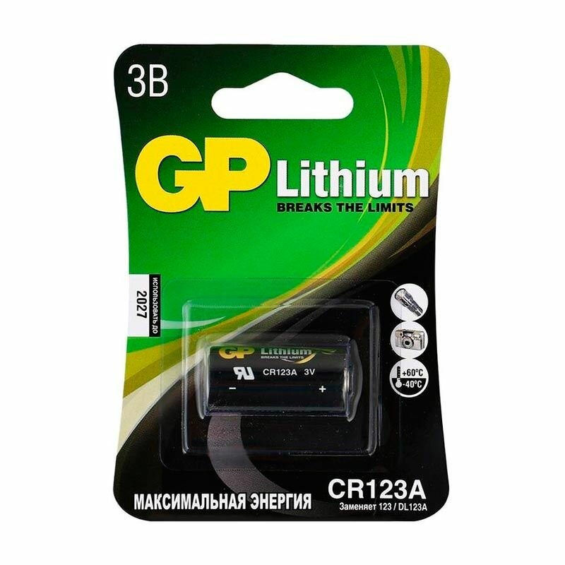 В блистере предусмотрен один элемент питания, обладающий форм фактором CR123A. Производители рекомендуют использовать GP Lithium в рабочем температурном диапазоне от -40 до +65 градусов Цельсия. Батарейка обладает показателями рабочего напряжения 3 В.