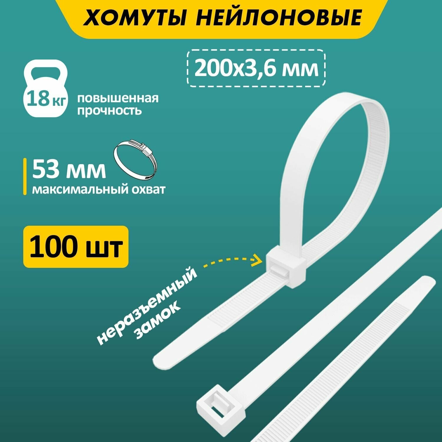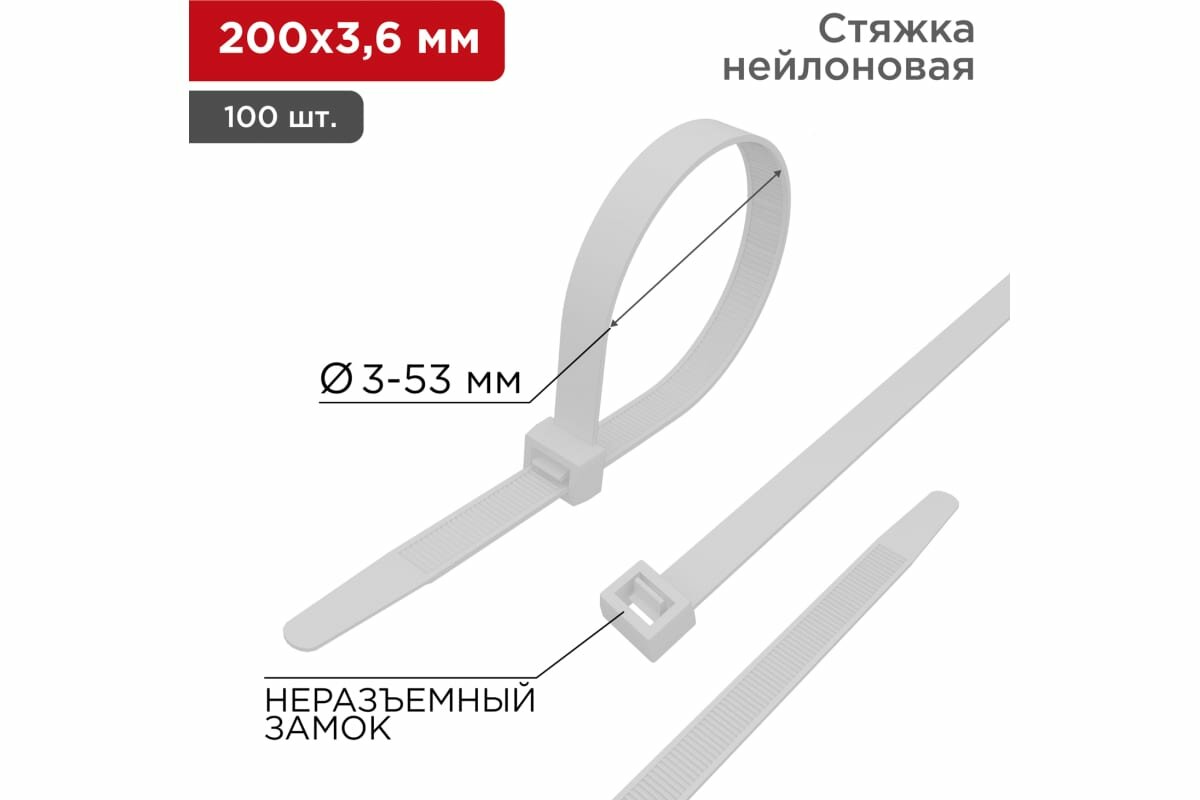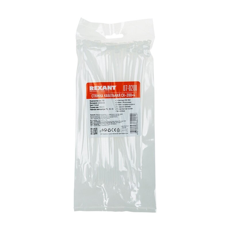 Хомут нейлоновый (кабельная стяжка) 200 х 4мм белый REXANT предназначен для крепления или обвязки в жгут кабелей и проводов, крепления гибких гофротруб, а также других предметов к несущей поверхности или для соединения между собой. Такая стяжка используются при проведении электромонтажных работ, при монтаже структурированных кабельных систем, для бытовых нужд, а также в других отраслях народного хозяйства. Представляет собой гибкую полоску из нейлона высокой прочности (полиамид-66) с замком на конце. Полиамид-66 - кристаллизующийся конструкционный материал имеющий высокую твердость и механическую прочность, отличающийся высокими электроизоляционными свойствами. Простой и удобный монтаж осуществляется вручную (следующим образом: большим пальцем левой руки прижать замок к пучку, а прав