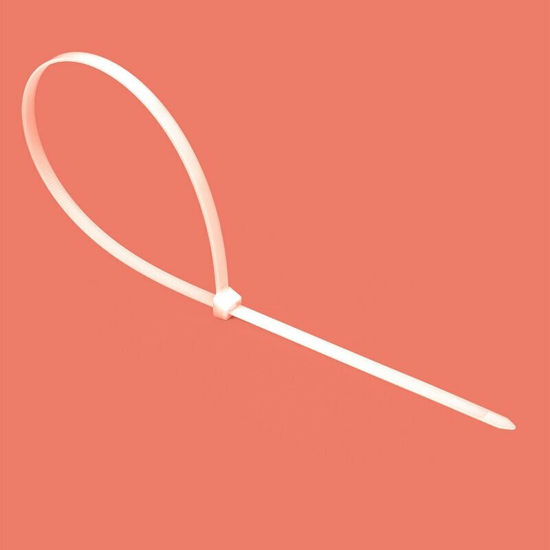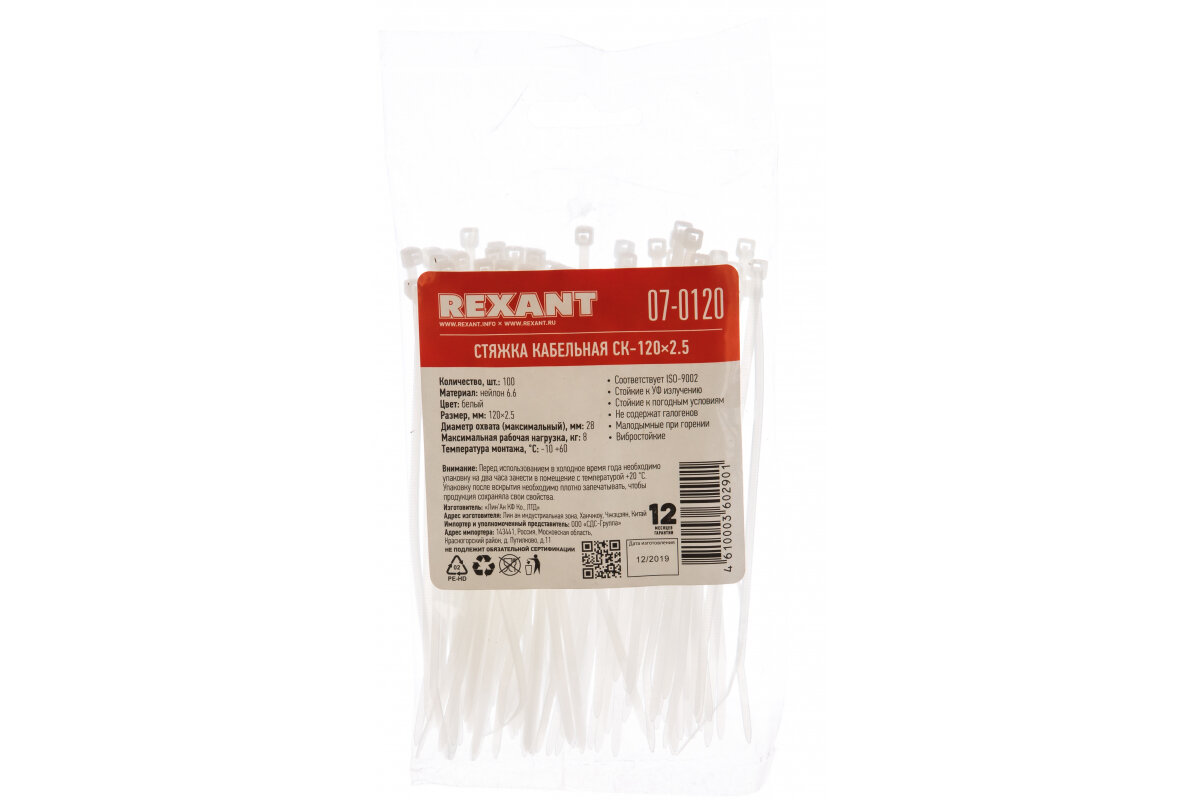 Хомут нейлоновый (кабельная стяжка) 120 х 2.5мм белый REXANT предназначен для крепления или обвязки в жгут кабелей и проводов, крепления гибких гофротруб, а также других предметов к несущей поверхности или для соединения между собой. Такая стяжка используются при проведении электромонтажных работ, при монтаже структурированных кабельных систем, для бытовых нужд, а также в других отраслях народного хозяйства. Представляет собой гибкую полоску из нейлона высокой прочности (полиамид-66) с замком на конце. Полиамид-66 - кристаллизующийся конструкционный материал имеющий высокую твердость и механическую прочность, отличающийся высокими электроизоляционными свойствами. Простой и удобный монтаж осуществляется вручную (следующим образом: большим пальцем левой руки прижать замок к пучку, а пр