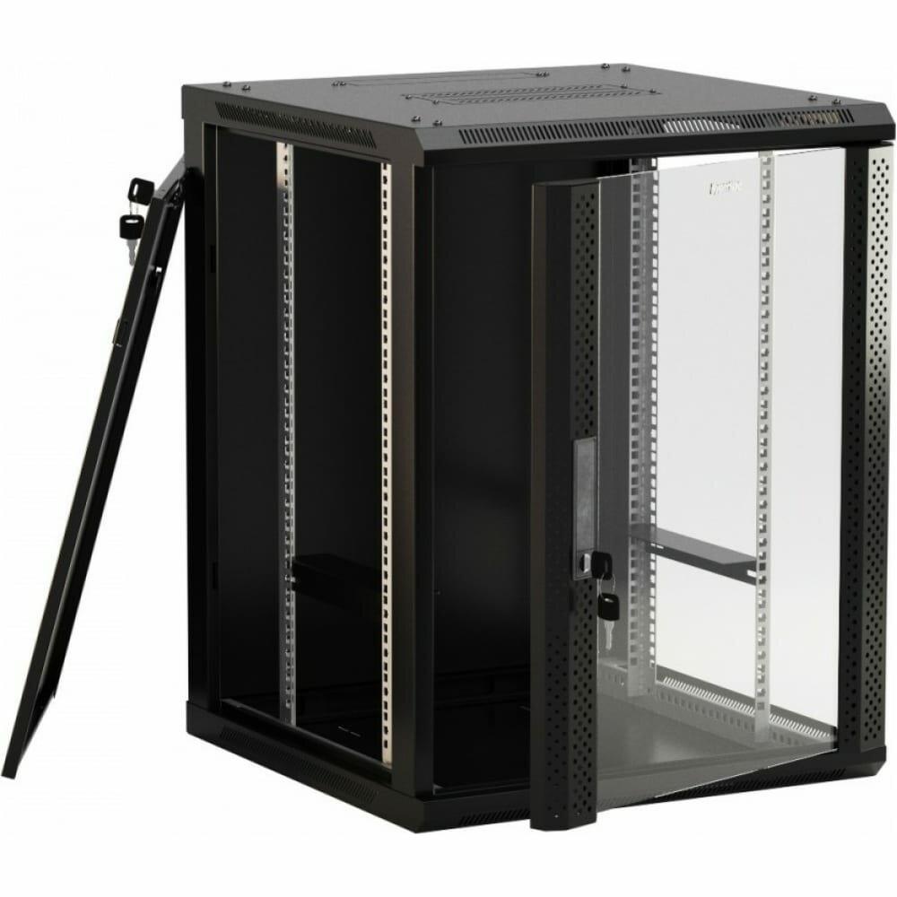 Hyperline TWB-FC-1866-GP-RAL9004 Шкаф настенный 19-дюймовый (19") 18U, 908x 600х 600мм, стеклянная дверь с перфорацией по бокам, ручка с замком, с возможностью установки на ножки, цвет черный RAL 9004