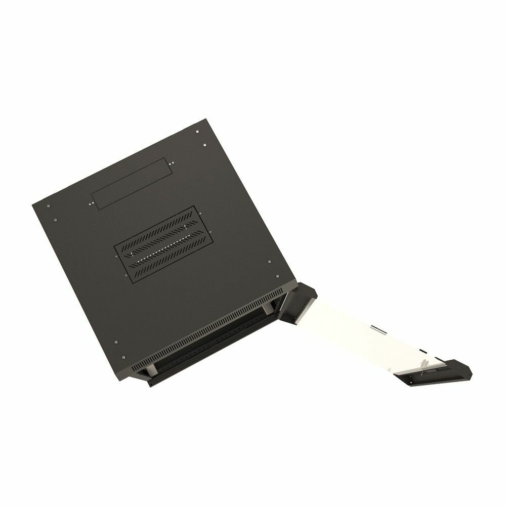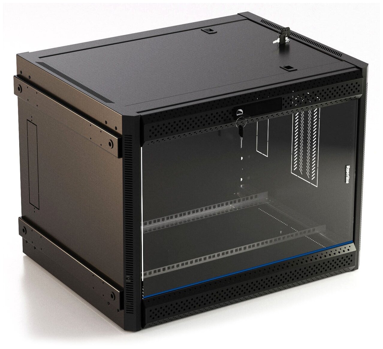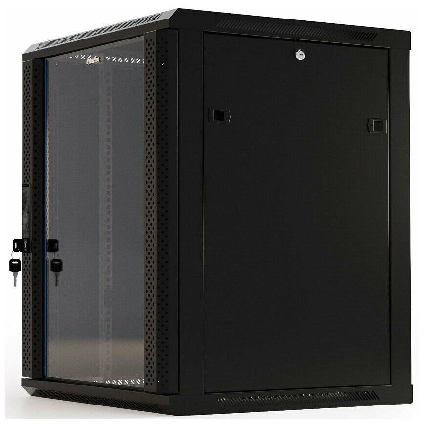 Hyperline TWB-FC-1866-GP-RAL9004 Шкаф настенный 19-дюймовый (19") 18U 908x 600х 600мм стеклянная дверь с перфорацией по бокам ручка с замком с возможностью установки на ножки цвет черный RAL (размер: 18 U)