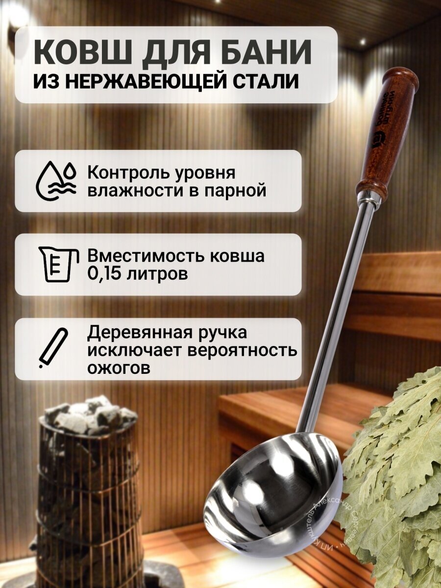 Данное изделие используется для обработки камней в парной различными травяными составами. Благодаря длинной ручке вы можете не бояться обжечься при поливании раскаленных камней. Ручка имеет продуманную форму и плотно ложится в руку, что также влияет на безопасность в парной. Ковш - не просто аксессуар, а постоянно используемый в бане инструмент, который прослужит Вам долгие годы.