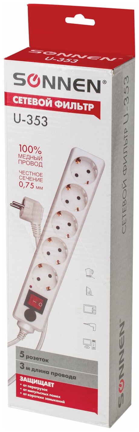 | Прочие особенности и свойства | Сетевой фильтр SONNEN U-353 - простой, удобный и экономный вариант защиты электроприборов от негативных последствий перепадов напряжения. Корпус выполнен из высококачественного негорючего пластика. |