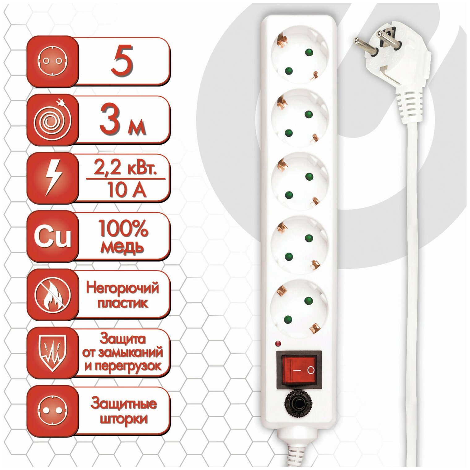 Модель: U-353 5гнезд с заземлением 220В 2.2кВт 3х1.0 выключатель 10А, 3м