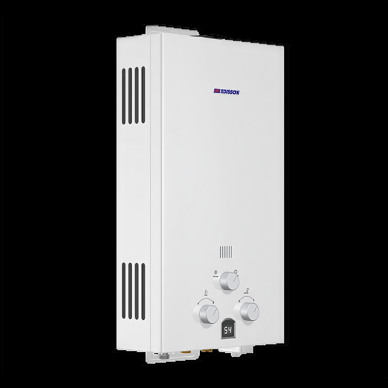 Водонагреватель проточный белого цвета, настроенный на работу на сжиженном газе.особенности устройства:• Усиленный медный теплообменник с защитным покрытием • Регулировка протока воды и объема подачи газа • Дисплей с индикацией температуры • Переключатель «зима-лето» для экономии газа в летний период • Многоступенчатая защита от перегрева, контроль пламени, контроль тяги • Адаптирована к российским условиям, работает при пониженном давлении воды и газа • Удобный сливной клапан обеспечивает защиту от избыточного давления • Электронный розжиг горелки, батарейки в комплекте