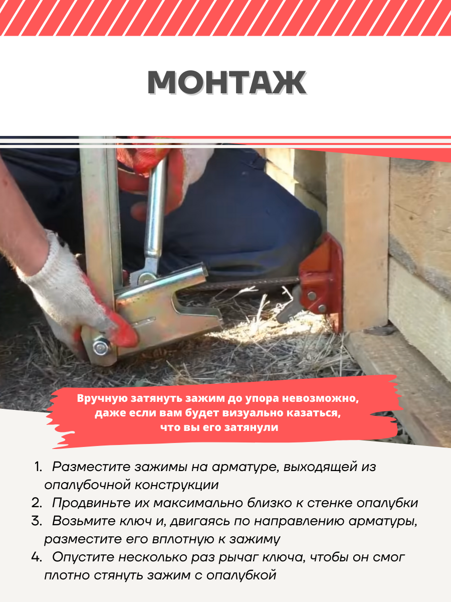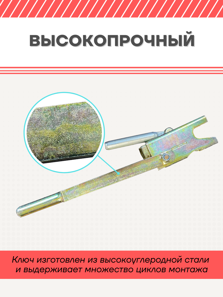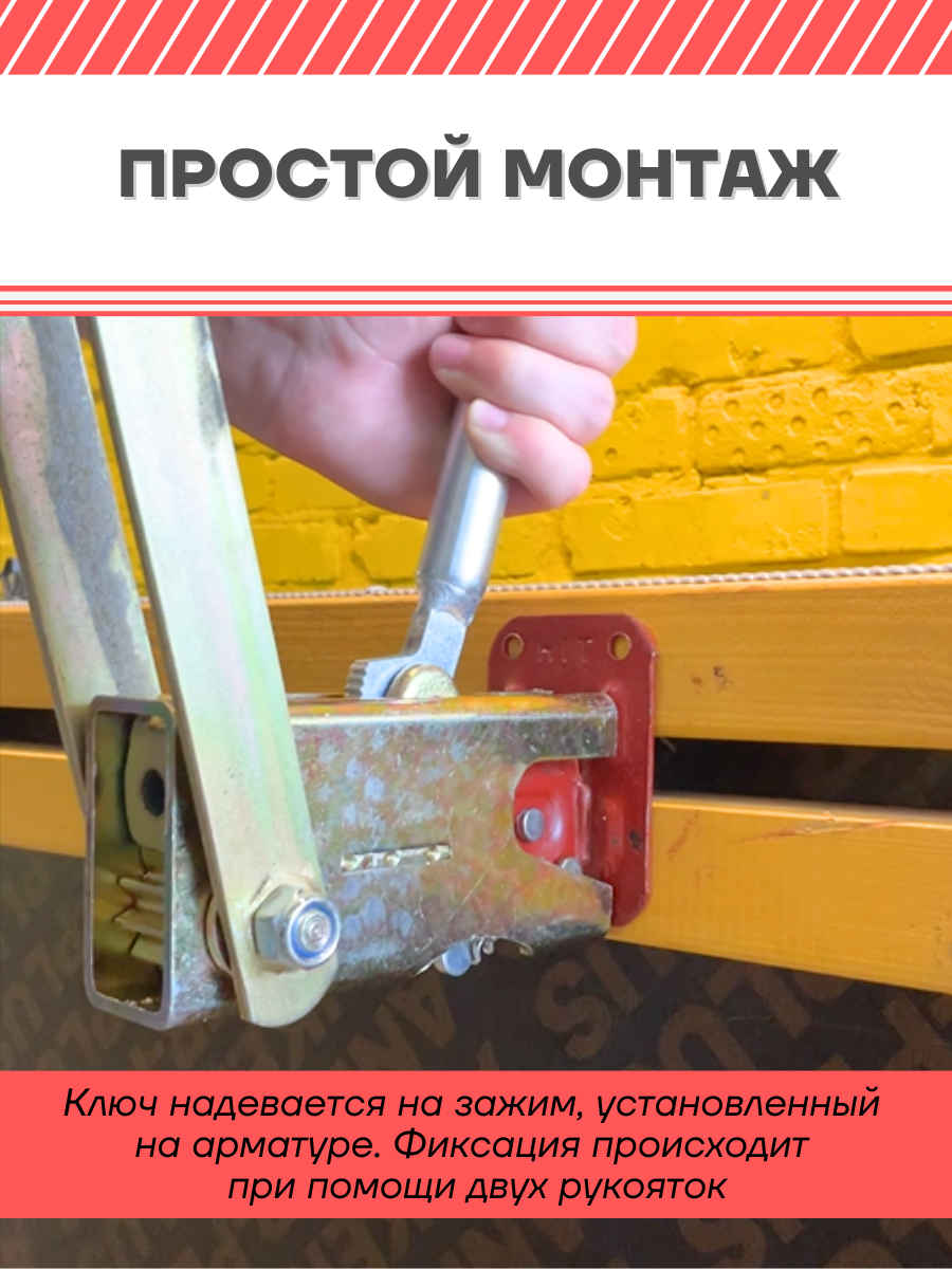 Ключ (клипсоверт) предназначен для фиксации пружинных зажимов Prom, Hit, TVT и TeaM. Сначала зажимы размещают на концах арматуры или катанки, выходящих из щитов опалубки, а затем фиксируют до упора ключом для обеспечения прочности и жесткости конструкции. Плотная стяжка необходима для предотвращения разрыва опалубки в процессе заливки бетона. Вручную затянуть зажим до такого упора невозможно. Фиксация ключом происходит с помощью рычага. Для распалубки зажима ключ не применяется. Чтобы снять зажим, достаточно по его язычку нанести несильный удар молотком. Ключ изготовлен из стойкой к коррозии и весовым нагрузкам стали.