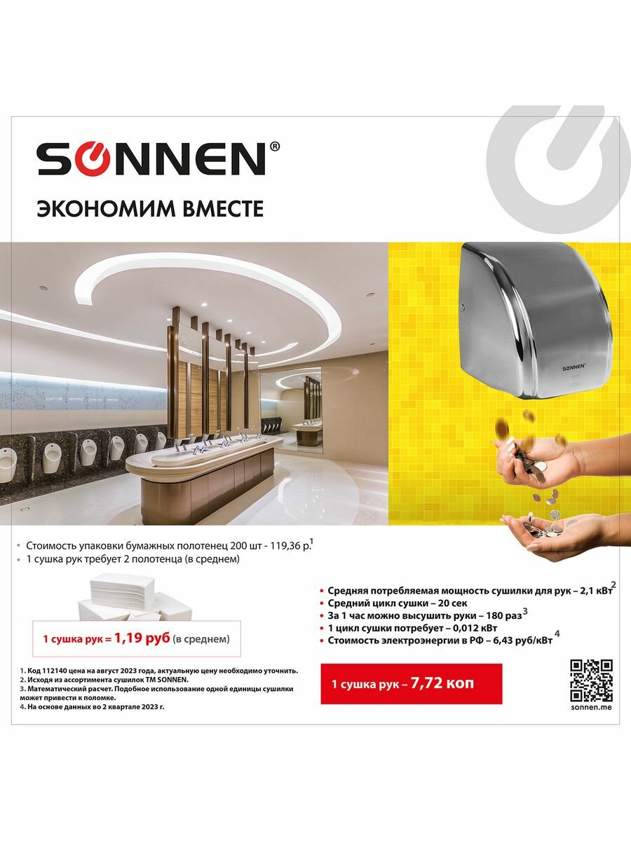 Сушилки для рук от китайского бренда SONNEN производятся с эргономичным дизайном, надежной конструкцией и с использованием качественных материалов. Также их выделяет на фоне аналогов демократичная цена и большой выбор моделей по мощности и производительности. В ассортименте можно выбрать сушилки для общественных мест разной проходимости.