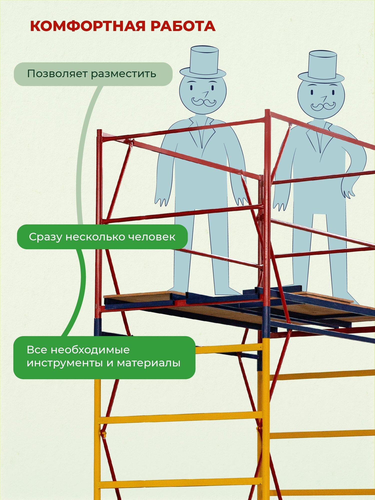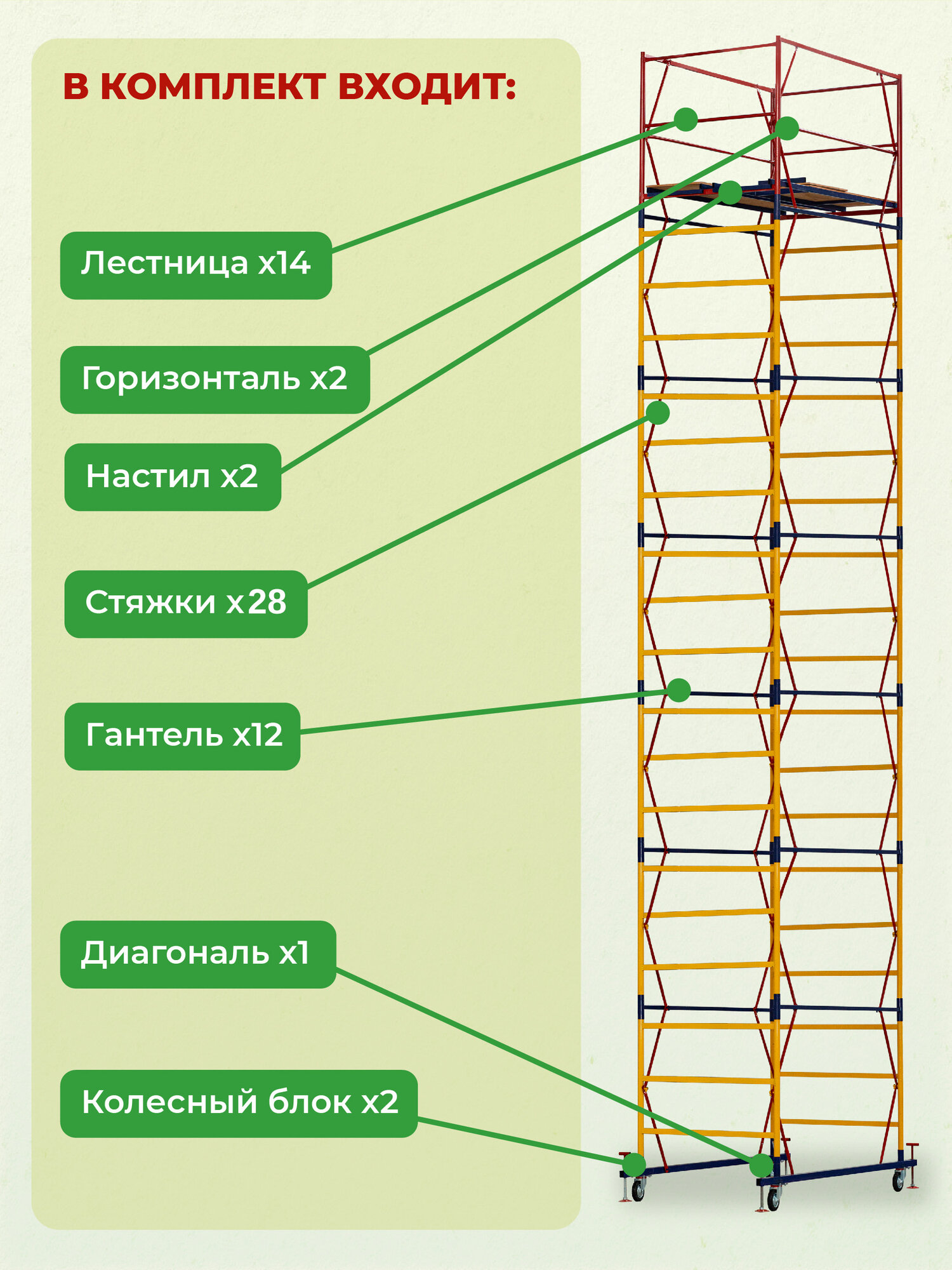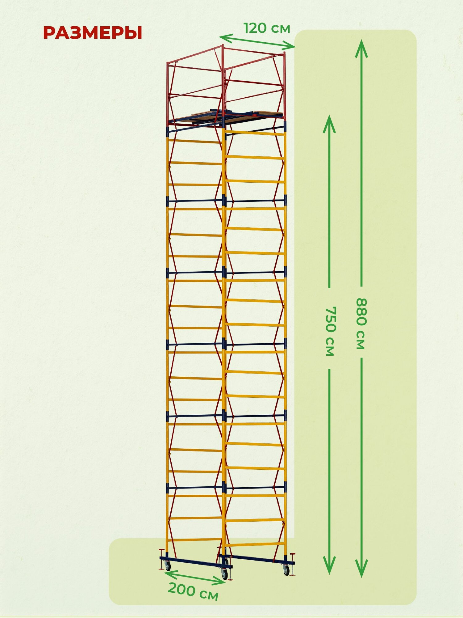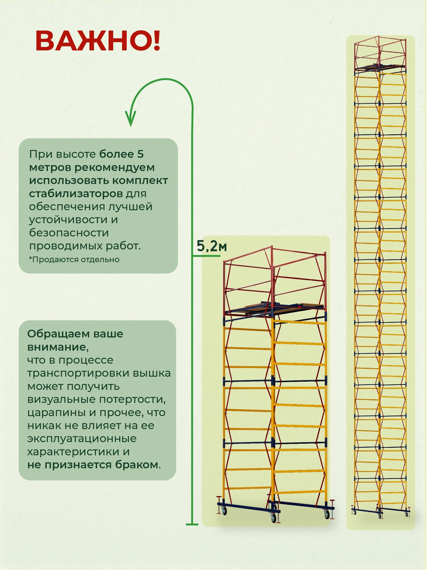 Вышка ВСП-250 шириной 1.2х2.0 метра - универсальная передвижная модель для строительных, ремонтных, монтажных работ как внутри помещения, так и для уличных работ с увеличенной рабочей площадкой. За счет ширины базового блока на ней комфортно работать сразу нескольким людям, разместив весь необходимый инструмент и материалы. Легко собирается без необходимости использования специального инструмента (все элементы соединяются флажковыми механизмами). Ее просто перемещать по объекту за счет наличия больших прорезиненных колес, которые снабжены фиксаторами положения. Позволяют тонко подрегулировать высоту вышки и зафиксировать ее от нежелательных перемещений во время работ.Данную модель вышки можно доращивать по высоте дополнительными секциями до 21 метров (не входят в стоимость). Высота до рабочей площадки составляет 1,6 метров. Секции вышки снабжены диагональными металлическими стяжками. Они обеспечивают дополнительную устойчивость при резких порывах ветра.Настил изготовлен из фанеры толщиной 10 мм, состоит из четырех независимых частей, в одной из которых есть люк для безопасного и удобного перемещения для проведения работ. Также настилы можно размещать на разных уровнях вышки для одновременных работ, соблюдая технику безопасности. Помните, вышка выдерживает общий вес до 250 кг. важно: при высоте вышки более 5 метров рекомендуем использовать комплект стабилизаторов для обеспечения лучшей устойчивости и безопасности проводимых на вышке работ. (Стабилизаторы в комплект не входят)Обращаем ваше внимание, что в процессе транспортировки вышка может получить визуальные потертости, царапины и прочее, что никак не влияет на ее эксплуатационные характеристики и не признается браком.
