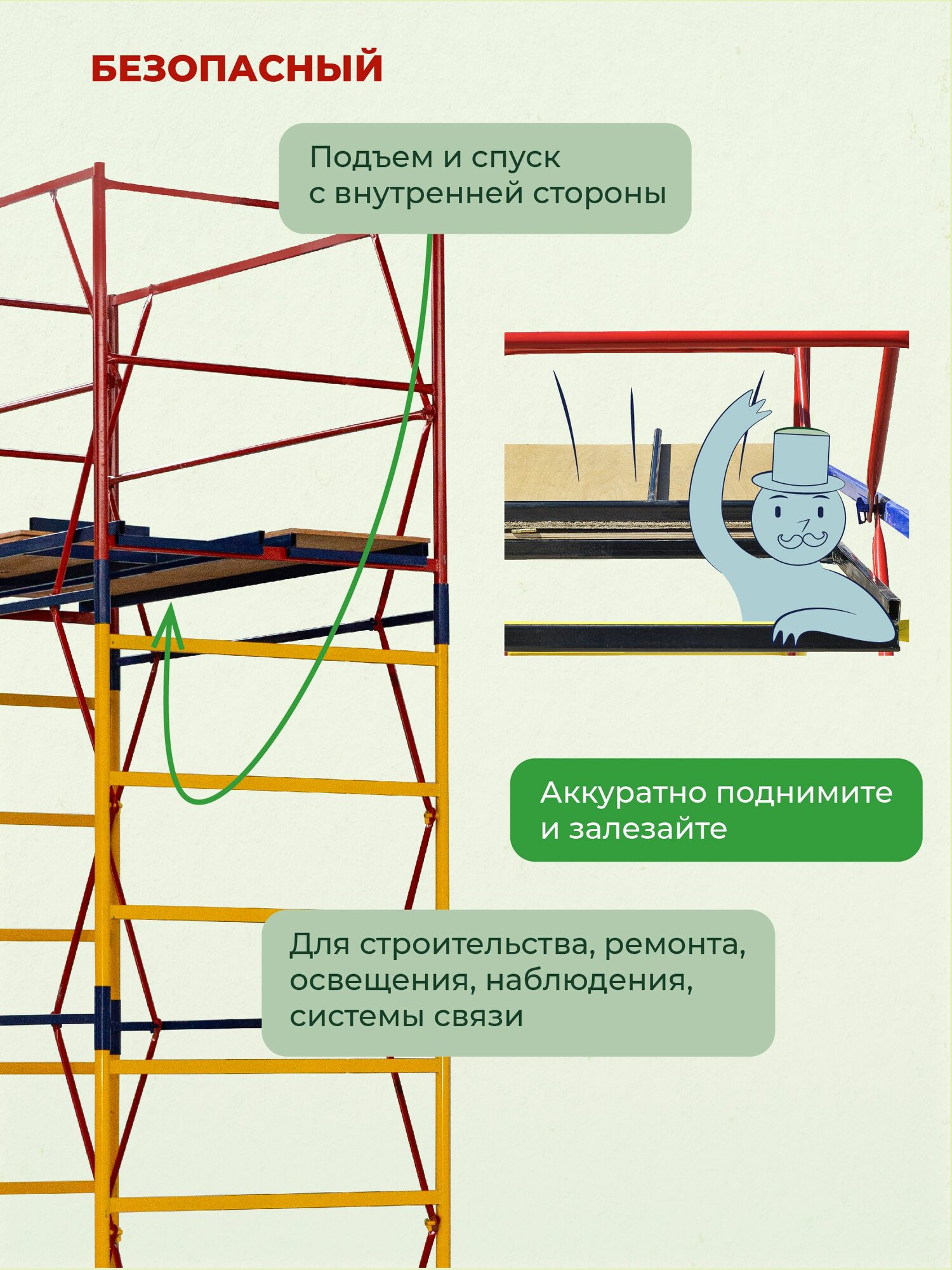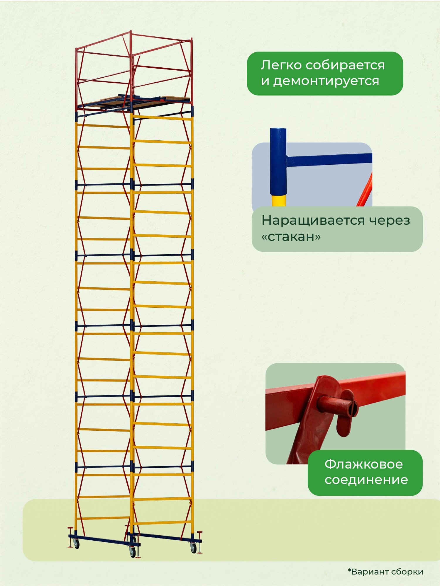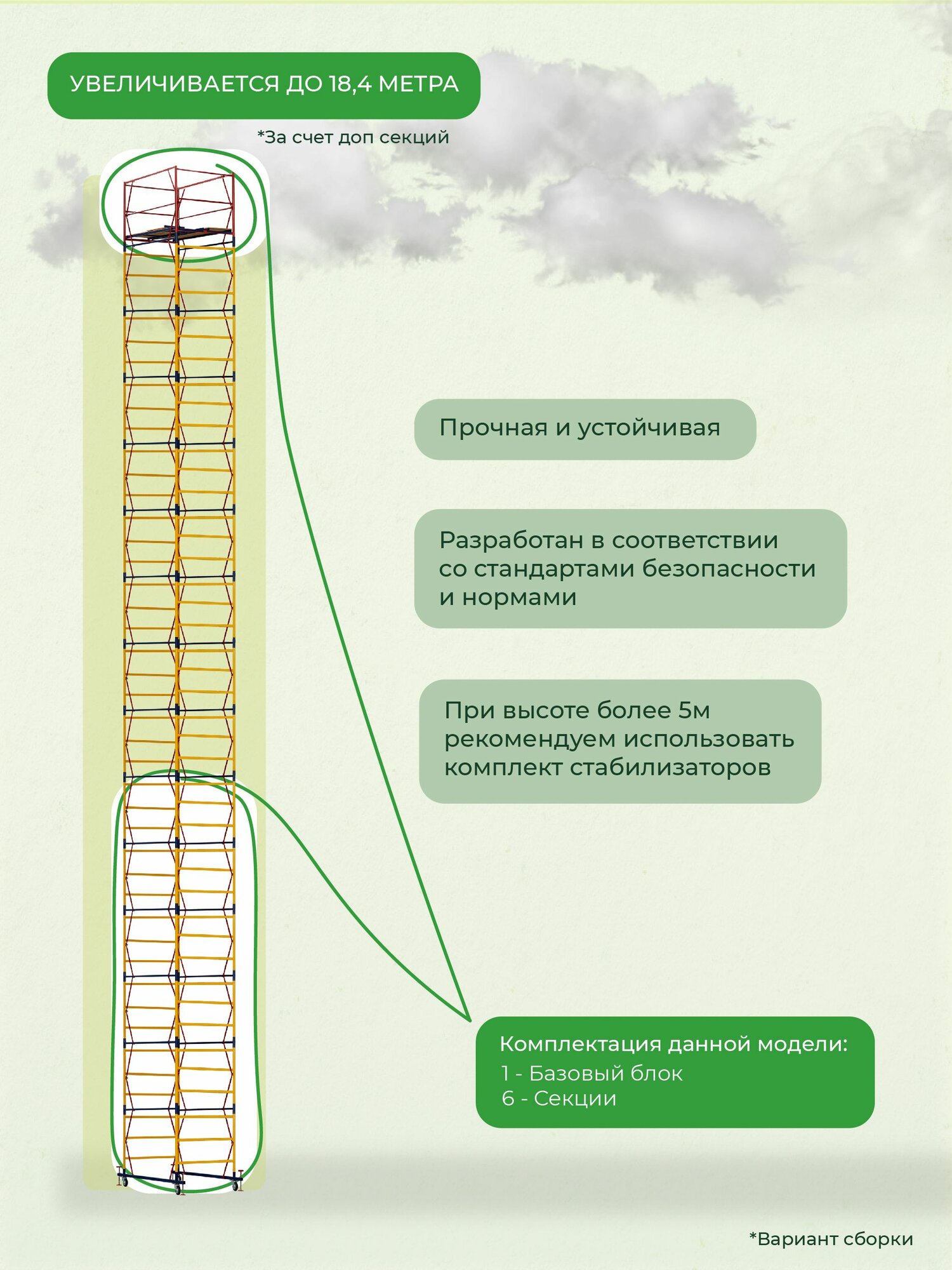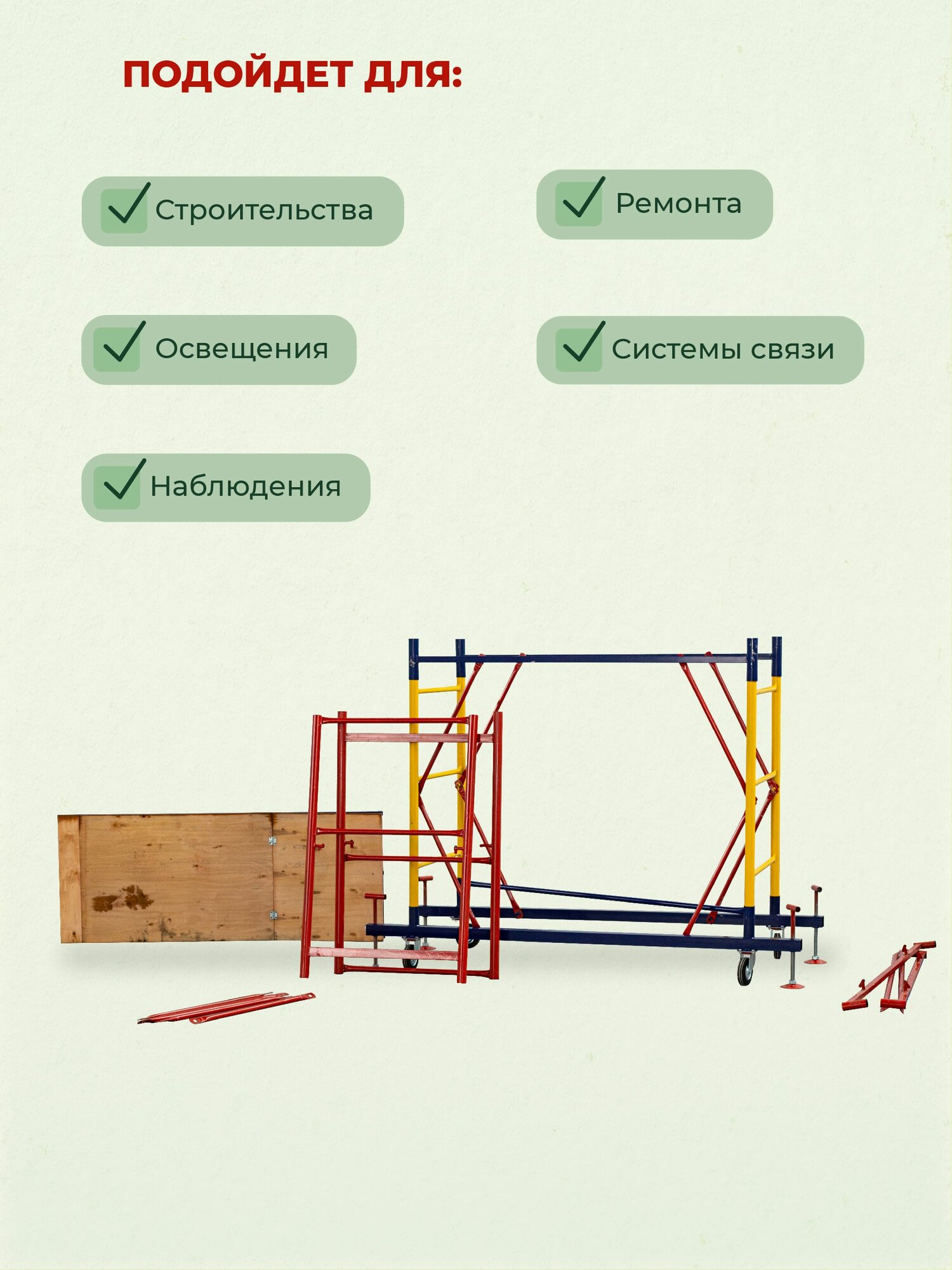 Вышка ВСП-250 шириной 1.2х2.0 метра - универсальная передвижная модель для строительных, ремонтных, монтажных работ как внутри помещения, так и для уличных работ с увеличенной рабочей площадкой. За счет ширины базового блока на ней комфортно работать сразу нескольким людям, разместив весь необходимый инструмент и материалы. Легко собирается без необходимости использования специального инструмента (все элементы соединяются флажковыми механизмами). Ее просто перемещать по объекту за счет наличия больших прорезиненных колес, которые снабжены фиксаторами положения. Позволяют тонко подрегулировать высоту вышки и зафиксировать ее от нежелательных перемещений во время работ.Данную модель вышки можно доращивать по высоте дополнительными секциями до 21 метров (не входят в стоимость). Высота до рабочей площадки составляет 1,6 метров. Секции вышки снабжены диагональными металлическими стяжками. Они обеспечивают дополнительную устойчивость при резких порывах ветра.Настил изготовлен из фанеры толщиной 10 мм, состоит из четырех независимых частей, в одной из которых есть люк для безопасного и удобного перемещения для проведения работ. Также настилы можно размещать на разных уровнях вышки для одновременных работ, соблюдая технику безопасности. Помните, вышка выдерживает общий вес до 250 кг. важно: при высоте вышки более 5 метров рекомендуем использовать комплект стабилизаторов для обеспечения лучшей устойчивости и безопасности проводимых на вышке работ. (Стабилизаторы в комплект не входят)Обращаем ваше внимание, что в процессе транспортировки вышка может получить визуальные потертости, царапины и прочее, что никак не влияет на ее эксплуатационные характеристики и не признается браком.