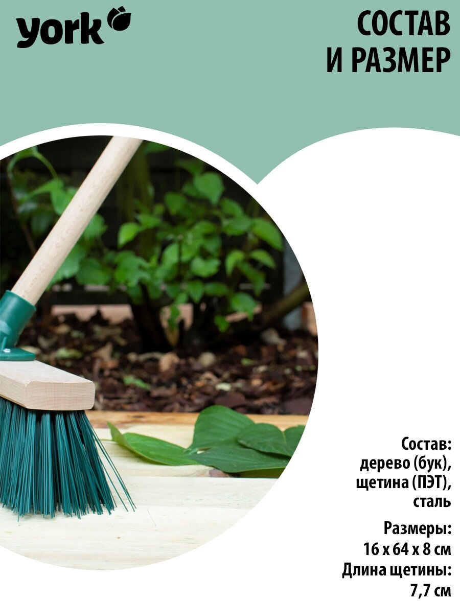 Хотите, чтобы ваш дом всегда был чистым и аккуратным? Деревянная классическая щетка для уборки помещений от YORK - это отличный выбор для тех, кто ценит комфорт и качество. Щетина уличной щетки расположена под углом, что позволяет захватывать максимальную площадь подметаемой поверхности, а оптимальная жесткость обеспечивает комфортный сбор пыли и мусора. Эта износоустойчивая щетка для улицы отлично подойдет для уборки во дворе, на открытой террасе или в саду - она прекрасно справляется с уборкой песка и листьев. Незаменимая в доме, эта универсальная щетка подойдет для уборки пола, кафеля и поверхностей кухни, дома, офиса, ванной, комнат и даже автомобиля! Правильно подобранная по толщине и гибкости щетина отлично подходит для очистки садовых дорожек и плитки от песка и листвы, проникает в труднодоступные места. Удобна для уборки улиц, тротуаров, гаражей и складов, любых помещений большой площади. Сметка предназначена для чистки, клининга и уборки на улице и дома. Она легкая и одновременно прочная, так что прослужит вам не один сезон. Состоящая из дерева (бука), щетины ПЭТ и стали, метла подходит ко всем типам рукояток. Ее густая, но достаточно жесткая щетина делает ее идеальным выбором для уборки складов, гаражей и производственных помещений. Размеры: 16 х 64 х 8 см и длина щетины 7,7 см делают этот садовый веник очень удобным в использовании. Жесткость щетины: жесткая. Состав: дерево(бук), щетина ПЭТ, сталь. Кроме того, он легкий и удобный в хранении, что делает его идеальным для использования в доме или в офисе. С заботой о вашем доме и здоровье, щетка YORK не содержит вредных химических веществ и легко моется. Она прекрасно держится в руке и не скользит, что обеспечивает безопасность при работе с ней. Купите себе эту прекрасную щетку для уборки помещений от YORK и убедитесь в ее высоком качестве и эффективности! Или подарите маме, подруге, любимой нужный и полезный подарок без повода или на новоселье. Выберите наши хозяйственные товары для дома и дачи и сделайте уборку в доме легче и приятнее! YORK, с заботой о вас и вашем домле!