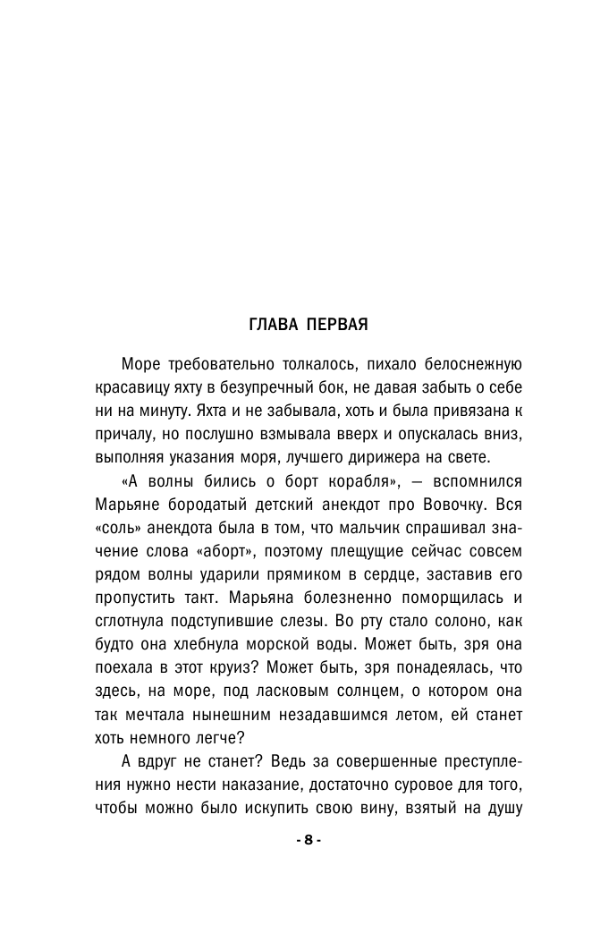 Чтобы поскорее забыть о неудачном романе, Марьяна отправилась в тур по Средиземноморью на шикарной суперсовременной яхте. На борту она узнала, что круиз будет особенный - путешественники должны представить себя сыщиками и расследовать предложенное организаторами дело. Однако все пошло не по плану: преступления стали происходить одно за другим, и придуманный детектив обернулся для туристов самым что ни на есть реальным! Но Марьяне повезло - в напарники ей достался капитан яхты, неотразимый красавец Олег Веденеев, одинокий морской волк...