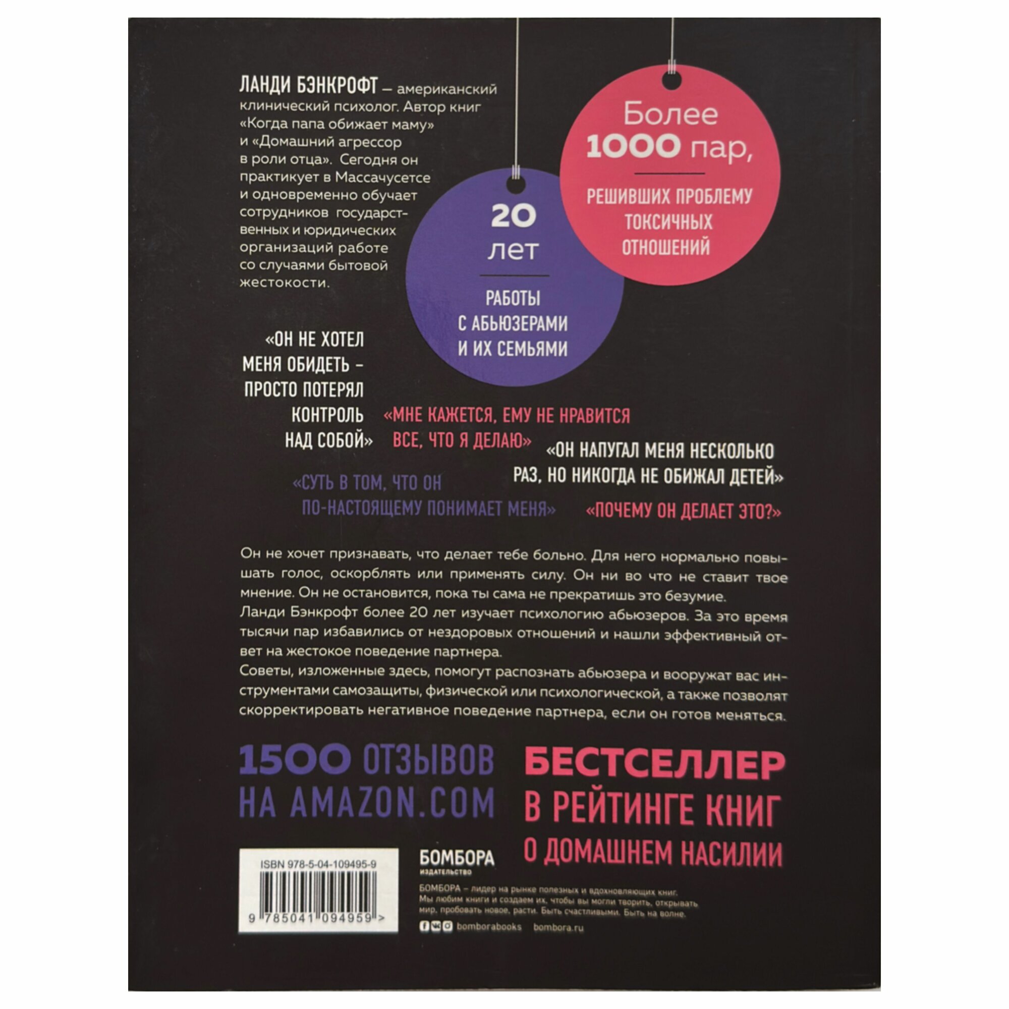 Я ходила со своим мужем-абьюзером к большому числу психотерапевтов, и все они предлагали упражнения на активное слушание и общение. Никто из них не понимал истинную проблему наших отношений и мои чувства, пока последний психотерапевт не вручил мне эту книгу, которая вытащила меня из этих отвратительных отношений и заставила меня снова начать жить. Запомните: если вы семейный психотерапевт или человек, который чувствует себя в своих отношениях ущемленным и несчастным, то купите и прочитайте эту книгу!