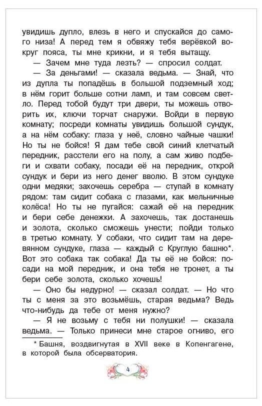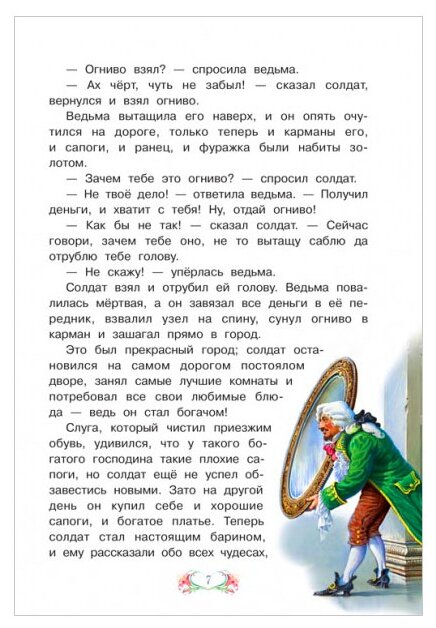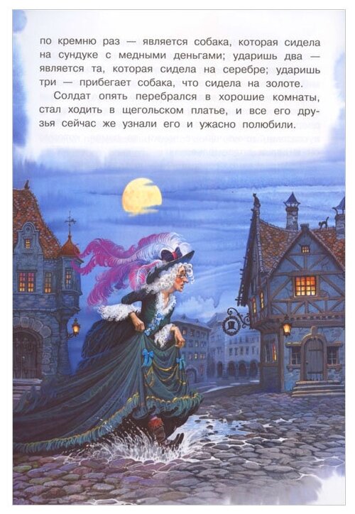 Выбрали "Огниво" именно этого издательства из-за симпатичного пса на обложке. Обычно собаки изображаются страшнющие, а тут вполне милый пёс. Обложка мягкая, листы белые, гладко-лощеные. Шрифт крупный, четкий. Подойдет для начинающих чтецов. Иллюстрации хоть и в компьютерной обработке. но очень даже красивые, расположены на каждом развороте. Сказка для маленьких детей вряд ли подойдет, в ней много страшных моментов - ведьме отрубают голову, солдата хотят повесить и уже виселица готова. Объяснять маленьким детям такие детали - неприятно и сложно. В целом же перевод вполне адаптированный под современных читателей.