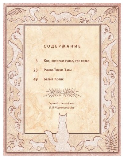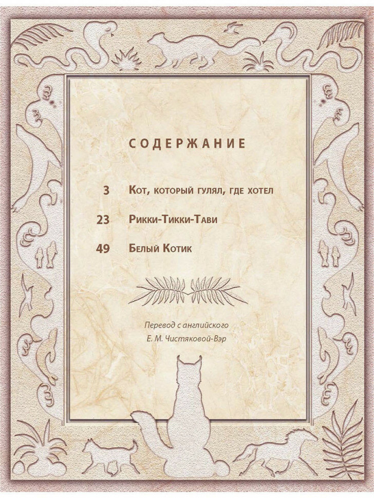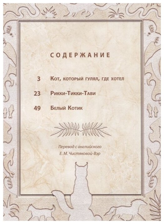 В сборник вошли три знаковых произведения Киплинга в замечательном переводе Е. М. Чистяковой-Вэр: "Кот, который гулял, где хотел", "Рикки-Тикки-Тави" и "Белый Котик". Натуралистичные и в то же время сказочные иллюстрации к ним создала известная художница-анималист Виктория Денисова.