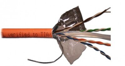 Кабель состоит из 4-х пар одножильных медных проводников.Диаметр проводника 23AWG. Каждый проводник заключен в изоляцию из полиэтилена (HDPE).Два проводника, скрученных со специально подобранным шагом, составляют одну витую пару.Пары отделены друг от друга крестообразной перегородкой увеличивающей переходное затухание между парами.4 витых пары и перегородка обернуты полиэтиленовой пленкой и вместе с медным одножильным заземляющим проводником заключены в общий экран из ламинированной фольги и оболочку из LSZH (ПВХ не выделяющий галогенов с малым выделением дыма).На оболочке кабеля нанесены последовательные метровые метки длины.