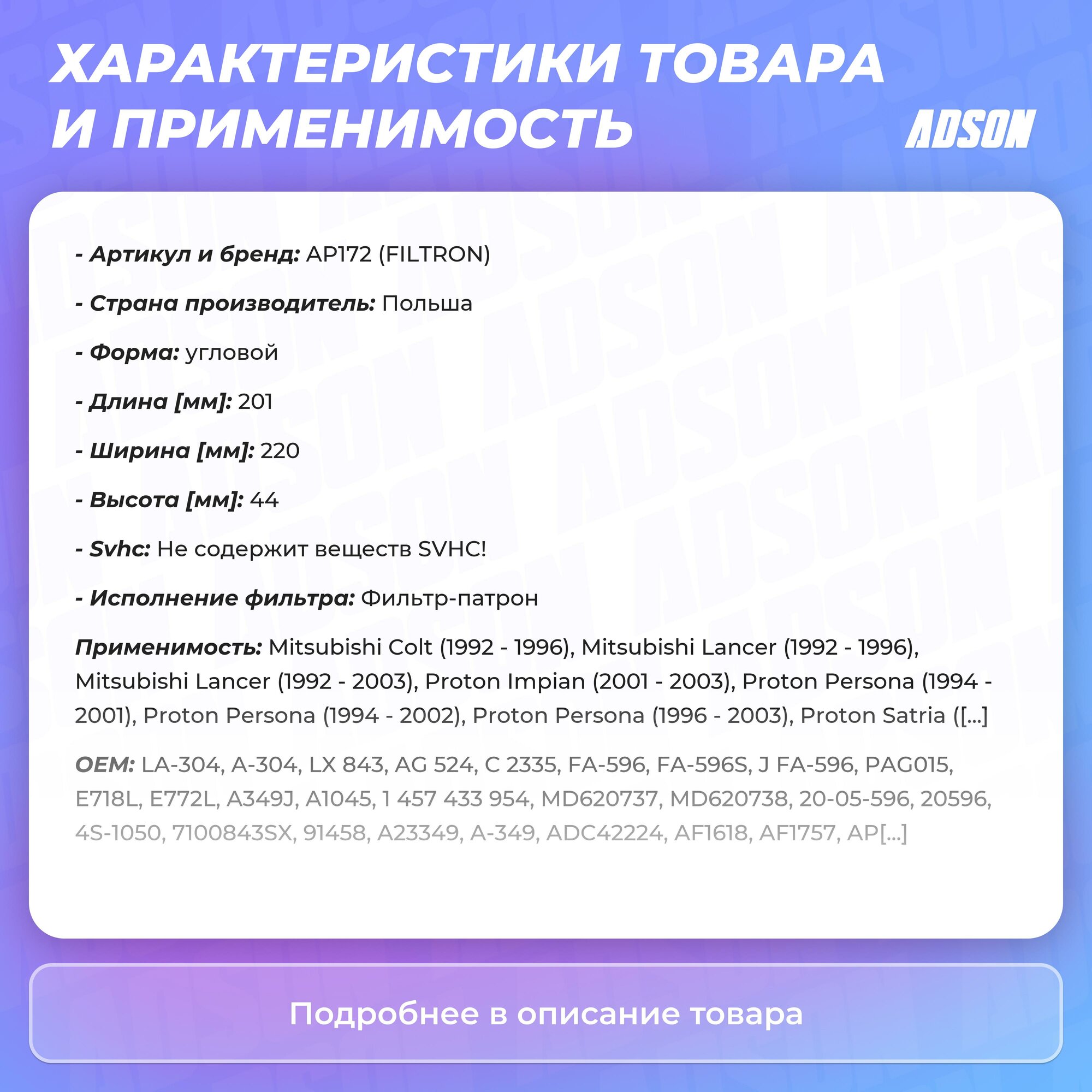 Фильтр воздушный FILTRON AP 172 для Mitsubishi Colt 1.3-1.8 92-96 / Lancer 1.6 16V 92> изготовлен с помощью современных фильтрующих материалов, созданных, в частности, на основе целлюлозных или синтетических волокон. Эти материалы обеспечивают эффективность фильтрации на уровне 99,9% для частиц размером всего в несколько микрон.Фильтрующая среда, стойкая к распространению огняВсе воздушные фильтры марки FILTRON имеют фильтрующие среды, которые, в соответствии с классом горючести F1 или S1, не поддерживают огонь (способствуют самоугасанию пламени) и могут защитить пассажиров от пожара транспортного средства в случае всасывания окурка сигареты в систему подачи воздуха.Прочные прокладки воздушных фильтров, обеспечивающие герметичностьДля производства прокладок воздушных фильтров используется уникальная смесь полиуретана, отличающаяся упругостью и устойчивостью к сжатию в экстремально высоких температурах. Благодаря исключительным свойствам прокладок, воздушные фильтры FILTRON сохраняют герметичность в корпусе даже в очень сложных условиях эксплуатации.Складки стабилизированы с помощью перфорированного покрытияСкладки (гофры) воздушных фильтров FILTRON стабилизируются с помощью специального перфорированного покрытия, предотвращающего слипание соседних складок. Благодаря равномерному распределению складок, воздух фильтруется всей поверхностью фильтрующего материала, способствуя полному использованию мощности двигателя.