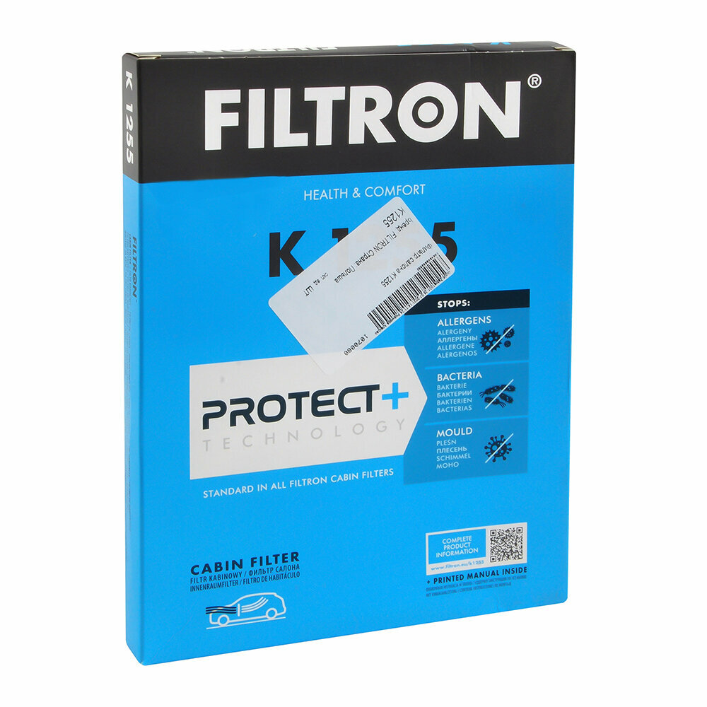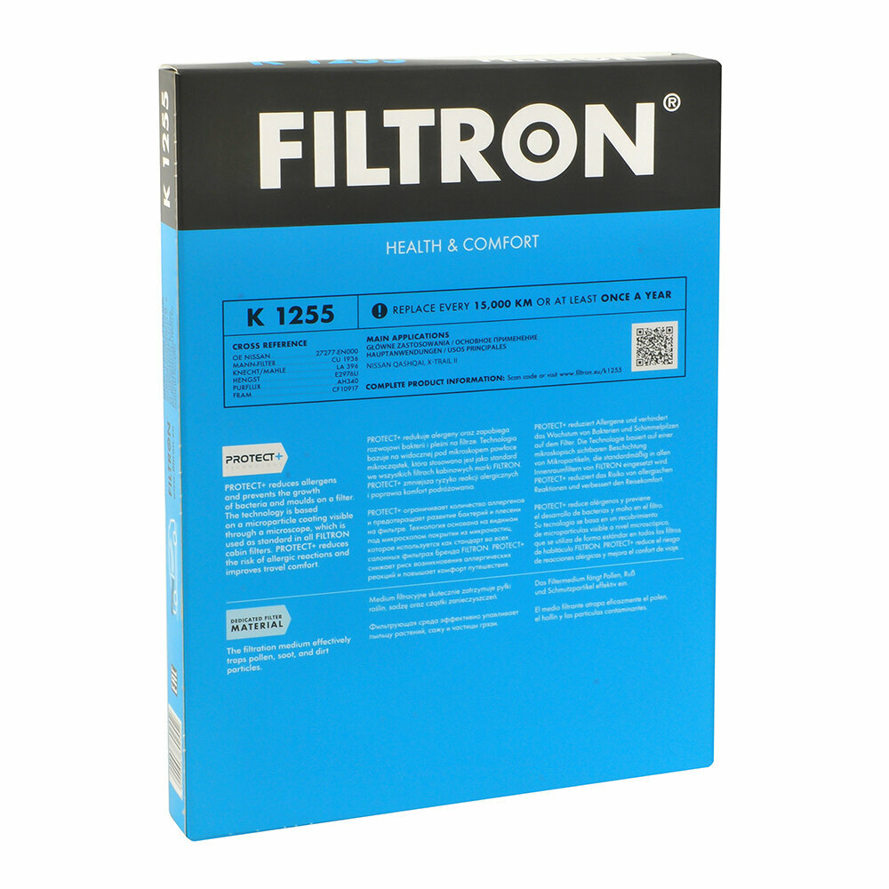 Фильтр салона FILTRON K 1255 для Nissan Qashqai/X-Trail 1.6/2.0/2.5/1.5DCi/2.0DCi 07> изготавливается с помощью высококачественных фильтрующих материалов, которые обладают электростатическими свойствами и, таким образом, способны удерживать даже микроскопические частицы вредных примесей (в несколько десятков раз меньше диаметра человеческого волоса).Дополнительная защита благодаря технологии PROTECT+Технология PROTECT+ уменьшает риск аллергических реакций и защищает пассажиров от аллергенов, бактерий и плесени, которые могут появиться на фильтре. Технология PROTECT+ основана на видимом под микроскопом покрытии из специальных микрочастиц. Эта технология используется в качестве стандартной в каждом фильтре салона FILTRON.Соответственно подобранное количество активированного угляСалонные фильтры с активированным углем, помимо твердых частиц, задерживают вредные газы и запахи. Количество активированного угля в фильтре подбирается таким образом, чтобы фильтр мог долго и эффективно очищать воздух от вредных летучих органических соединений.