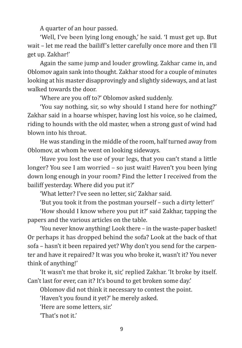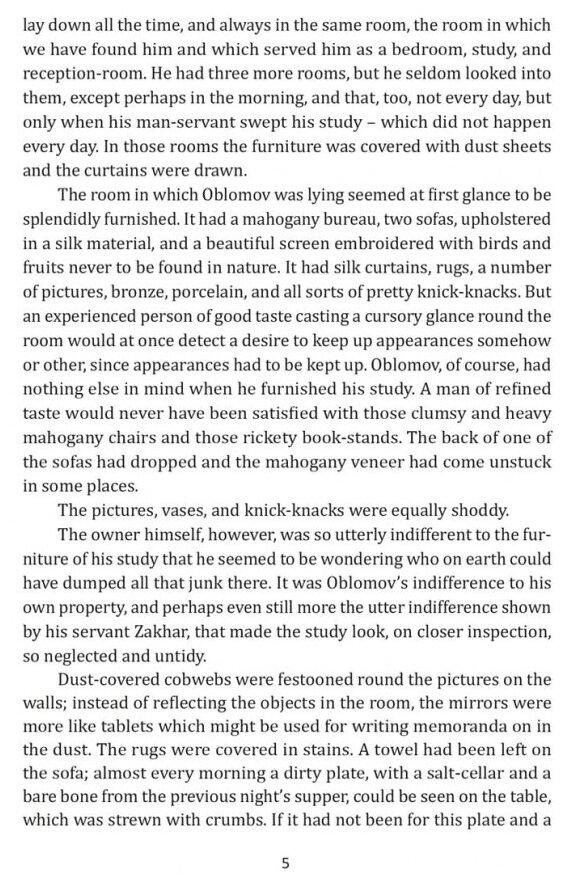 Хочу поделиться положительным отзывом и отметить особенности книги. Белоснежная бумага, карманный формат. Бисерный шрифт!! По содержанию, сложностей в переводе не замечено, кроме недостатка словарного запаса и каких-то для меня не часто встречающихся слов. Если бы меня попросили перечислить существительные, как ассоциации на это произведение(напишу на русском): диван и халат, луна и гроза, кофе и сигары, сирень. Все это литературный символизм, который можно разобрать «по полочкам». Не пересказываю, просто отмечаю, что в этой книге особая атмосферность с первых страниц, которую я нигде не встречала более, та самая «обломовщина». Сонный ритм. Зимняя спячка, которую пробуждает любовь(весенний период) к Оле Ильинской, летний расцвет и благоухание(сирень я уже отметила) и умирание природы, завершение развития их отношений, как осенняя хандра. И снова символ, символ конца: замерзшая Нева. Из цитат более всего понравилось следующее: