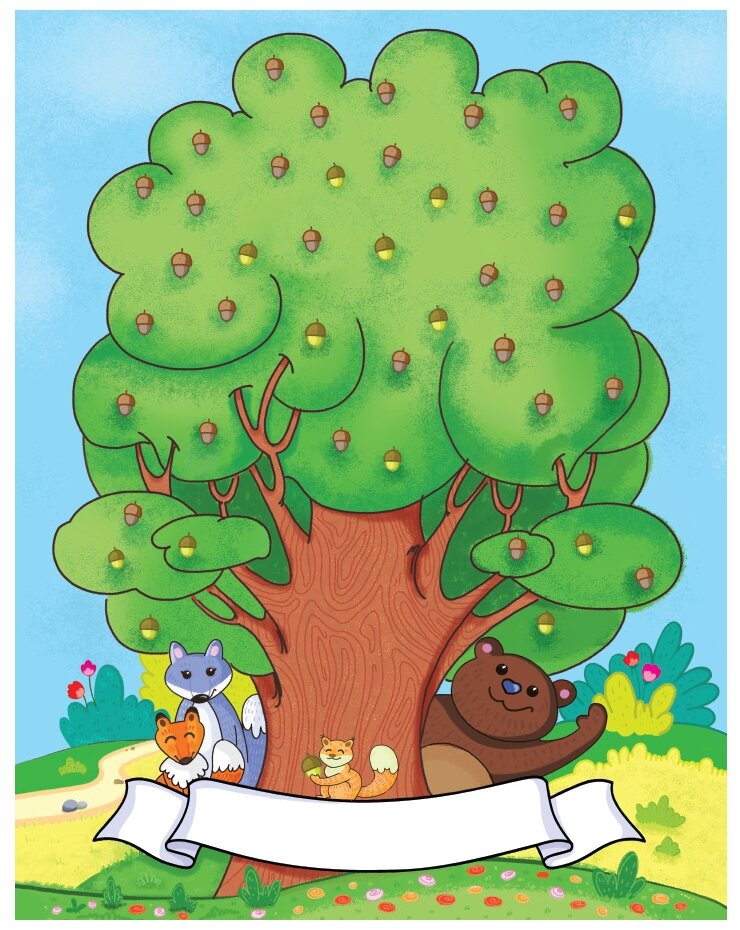 В конверте: яркий, красочный плакат с изображением древа, наклейки для обрамления фотографий на семейном древе.