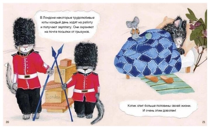 Из книги мы узнаем, что коты не любят запаха цитрусовых и не чувствуют вкуса сладкого. Зато коты могут пить соленую морскую воду и легко могут прыгнуть на высоту, равную пяти кошкам. А еще «Котик умеет говорить сто разных МЯУ, а собака только десять разных ГАВ.» Есть в этой книге про котов даже наш любимый слон! И, оказывается, слоны тоже умеют мяукать, как кошки, белки и лемуры. В самом конце книги малышей ждут раскраска, загадка и несколько несложных заданий на трех разворотах. Мне кажется, что малышам эта книга непременно понравится.