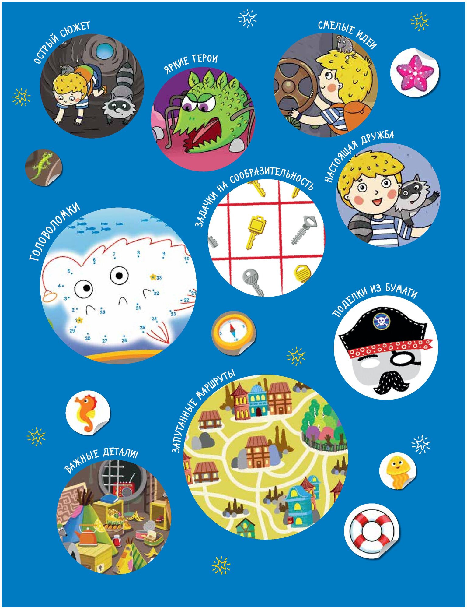 Во-вторых, это головоломки и задания, напрямую связанные с сюжетом, 8 поделок, настоящий дневник путешественника и 100 многоразовых наклеек!