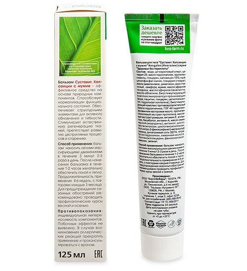 Бальзам для тела "Суставит. Капсаицин с мумие" Neogalen (Неогален)серии "Здоровье без переплаты"- эффективное средство на основе природных компонентов. Способствует нормализации функционального состояния. Обеспечивает структурными элементами для активного обновления и гибкости. Стимулирует естественную регенерацию тканей, препятствует развитию деструктивных процессов и старению. Действие и эффективность бальзама для тела обеспечены высокой биологической активностью его натуральных компонентов, обладающих выраженным положительным комплексным действием. Капсаицин оказывает сильное разогревающее действие, активизирует обменные процессы в мышечной ткани, улучшает микроциркуляцию. Снижает отёчность, снимает мышечный спазм, является проводником для других лечебных компонентов. Блокирует действие химических медиаторов, провоцирующих воспаление и передающих болевые импульсы в ЦНС. Мумие (Asphaltum) - один из самых мощных биостимуляторов, активизирует репаративные процессы, ускоряет восстановление костных и хрящевых тканей, замедляет процессы старения сустава, способствует уменьшению ломоты, возникающей при переменах погоды. В несколько раз усиливает лечебные свойства лекарственных растений. Камфора добывается из листьев и древесины камфорного дерева Ciamomum camphora, произрастающего в Индии и Китае. При наружном применении в области суставов оказывает антисептическое, согревающее, анальгезирующее и противовоспалительное действие, расширяет кровеносные сосуды и улучшает трофику околосуставных тканей. Эфирные масла лекарственных растений оказывают антисептическое, регенерирующее, болеутоляющее, спазмолитическое, противовоспалительное, против отёчное действие. Не является лекарственным средством.