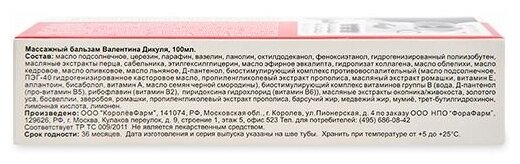 Высокоэффективное, проверенное на практике, средство для местного применения, разработанное академиком Валентином Ивановичем Дикулем, специалистом по болезням опорно-двигательного аппарата. Действие натуральных компонентов бальзама направлено на активизацию кровообращения и метаболизма в околосуставных тканях, уменьшение неприятных ощущений. Эффективность бальзама обусловлена целебными свойствами и синергизмом действия входящих в него компонентов.