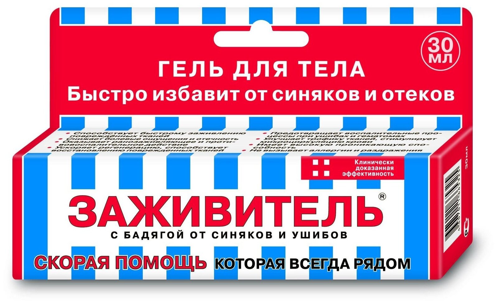 Эффективное средство на основе натуральных активных компонентов, предназначено при поверхностных травмах - ушибах, синяках, гематомах. Облегчает боль, снижает риск образования синяка и гематомы, стимулирует их рассасывание. Бадяга ,входящая в состав геля, обладает уникальным бактерицидным и отшелушивающим действием.