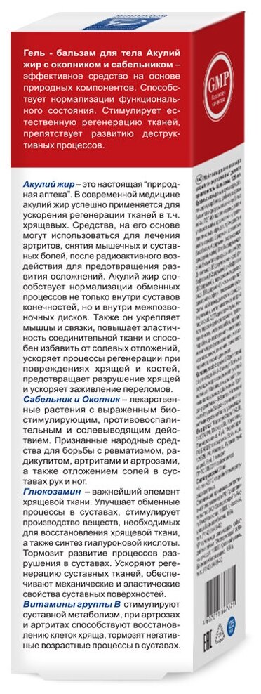 Средства, на основе акульего жира, способствуют укреплению иммунитета, снятию признаков воспаления, выведения накопленных токсинов, поэтому могут использоваться для лечения артритов, снятия мышечных, суставных болей, после радиоактивного воздействия для предотвращения развития осложнений. Гель-бальзам способен нормализовать обменные процессы не только внутри суставов конечностей, но и внутри межпозвоночных дисков. Он также укрепляет мышцы и связки, и способен избавить от солевых отложений. Ускоряет процессы регенерации при повреждениях хрящей и костей, предотвращает разрушение хрящей, ускоряет заживление переломов, снимает болевой синдром, повышает эластичность соединительной ткани. Окопник способствует восстановлению поврежденных тканей, стимулирует регенерацию костной и хрящевой ткани при заболеваниях суставов, заживляет суставные микротравмы, ускоряет процесс сращивание костей при переломах.