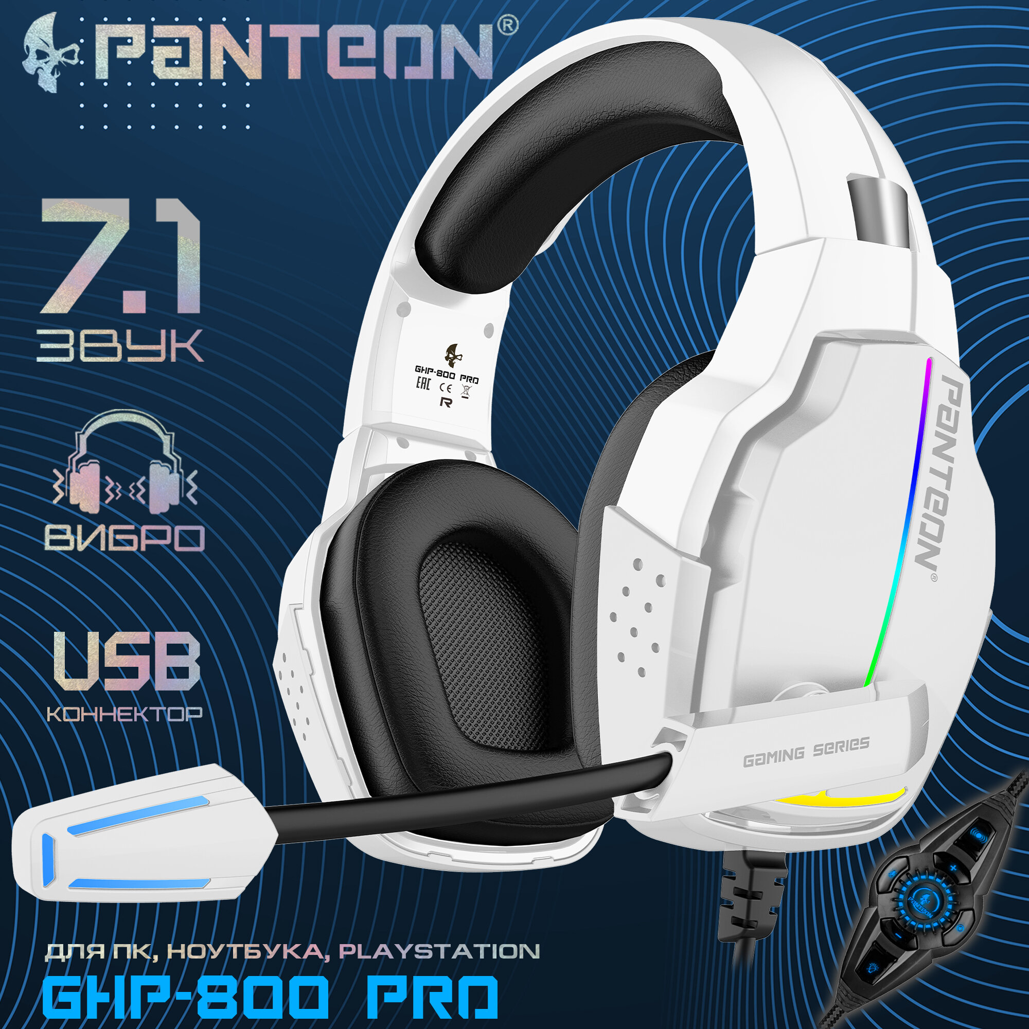 Игровые наушники из серии PANTEON - это именно то, что нужно геймеру, и даже немного больше. 50-миллиметровые динамики выдают глубокий, чистый звук. Встроенная звуковая карта для создания виртуального объемного звука SURROUND SOUND 7.1 дарит эффект полного погружения в игровую вселенную. Позволяет не только глазами, но и по звуку определить откуда доносятся выстрелы и вовремя услышать подкрадывающегося со спины врага. Виброотклик на низкие частоты выводит ощущение игровой реальности на новую высоту.Специально созданное программное обеспечение позволяет ювелирно настраивать звук в зависимости от предпочтений и игровых потребностей. Пользователь всегда может выбрать один из готовых эффектов или настроить эквалайзер самостоятельно. Настройка эквалайзера - звук в наушниках будет максимально соответствовать вашему вкусу. Настройка эквалайзера позволяет изменить звук практически до неузнаваемости и найти оптимальное звучание для различных частот. Настройка виртуального звука SURROUND SOUND 7.1 позволяет регулировать положение виртуальных динамиков, располагая их дальше или ближе, а также меняя их положение в окружности. В меню настройки микрофона можно воспользоваться функцией изменения голоса в 5 различных вариантов. Как и положено игровому устройству, PANTEON оснащены подсветкой RAINBOW на чашах и однотонной подсветкой на микрофоне, которая расположена с внешней стороны и не будет мешать при использовании. Чувствительный всенаправленный микрофон оснащен двойным механизмом регулировки положения: ротационная конструкция прикрепления к чаше позволяет найти удобное положение по вертикали, гибкая ножка - тонко подстроить положение и в вертикальной, и в горизонтальной плоскости.Мягкое регулируемое оголовье обеспечивает комфортную посадку. Амбушюры выполнены из экокожи высокого качества, а их вытянутая форма гарантирует удобную посадку и отсутствие давления на ушную раковину, что немаловажно при долгой игре. Еще одним преимуществом модели стали поворотные на 90 градусов чаши. Благодаря этому гарнитура еще удобнее в использовании и в транспортировке.Прочный гибкий кабель в нейлоновой оплетке с ферритовым фильтром надежно передает сигнал без потерь и искажений. Длина кабеля 2,1м достаточна для полной свободы действий без опасности случайно отключить наушники от компьютера.Функциональный пульт управления, расположенный на проводе позволяет регулировать громкость, включать и отключать микрофон, звук, виброотклик и подсветку.