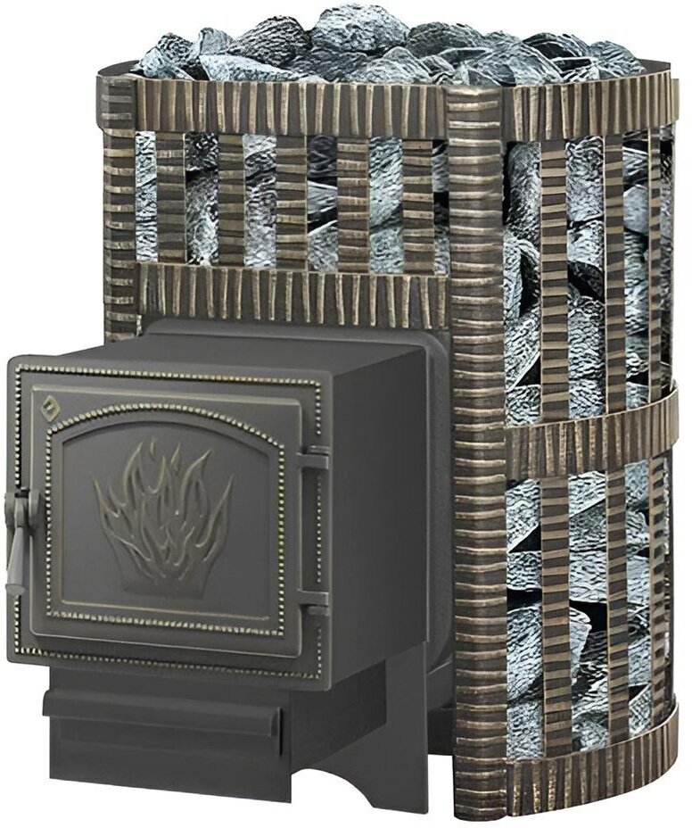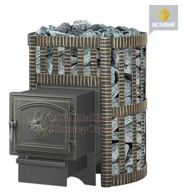 Банная чугунная печь укомплектована чугунной герметичной дверцей Везувий 261. Конвекционно-вентилируемый кожух "Ковка" изготовлен из металлической текстурированной полосы покрашенной термостойкой краской и покрытая патиной «Бронза».