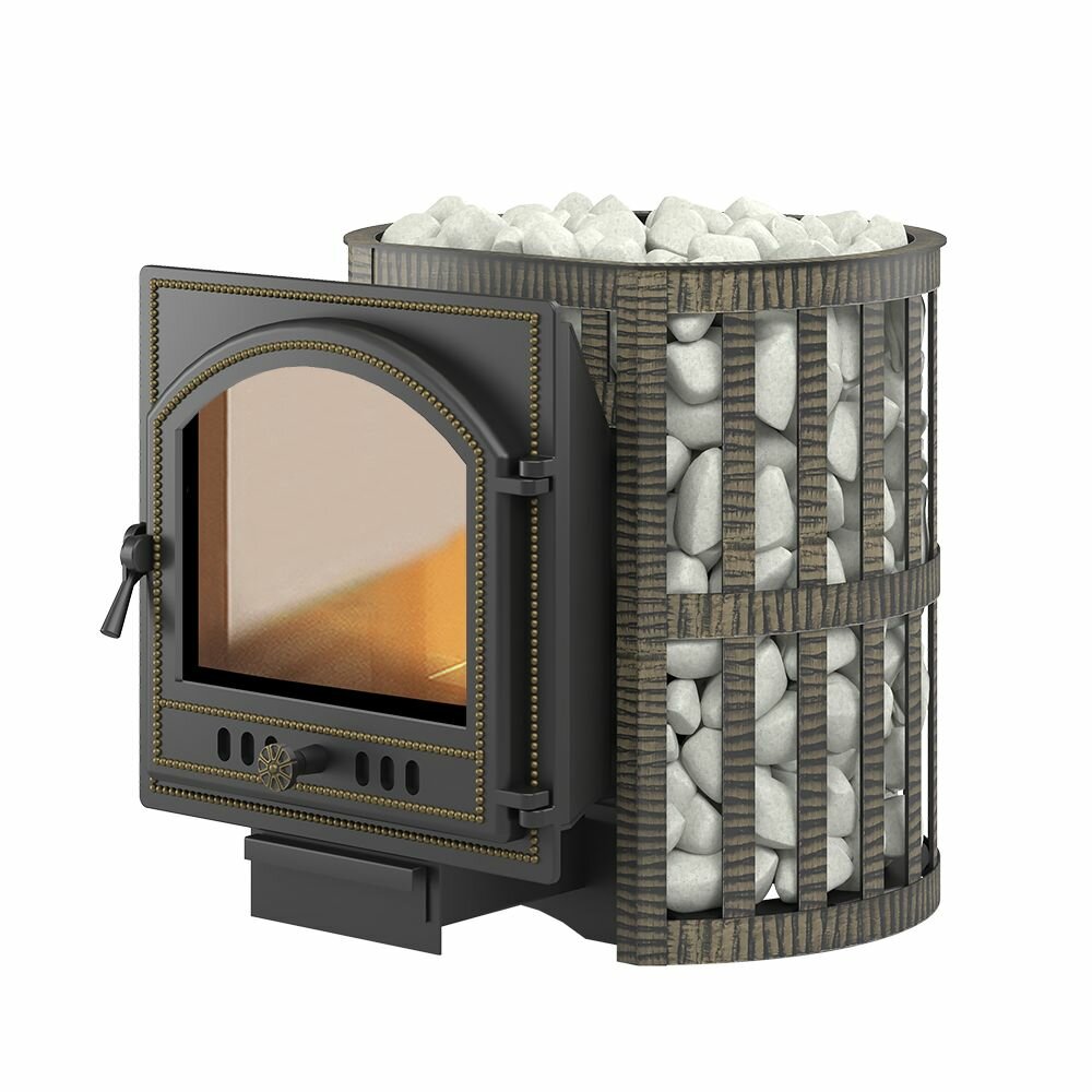 Банная чугунная печь Легенда Ковка 16 камин (205) укомплектована чугунной герметичной, самоохлаждаемой дверцей Везувий 205 с жаропрочным стеклом «SHOT ROBAX», с оборудованной системой самоочистки, и конвекционно-вентилируемый кожухом "Ковка". В конструкции данной печи предусмотрен топочный тоннель длиной 250 мм, при помощи которого печь топится из соседнего помещения, смежного с парильным.