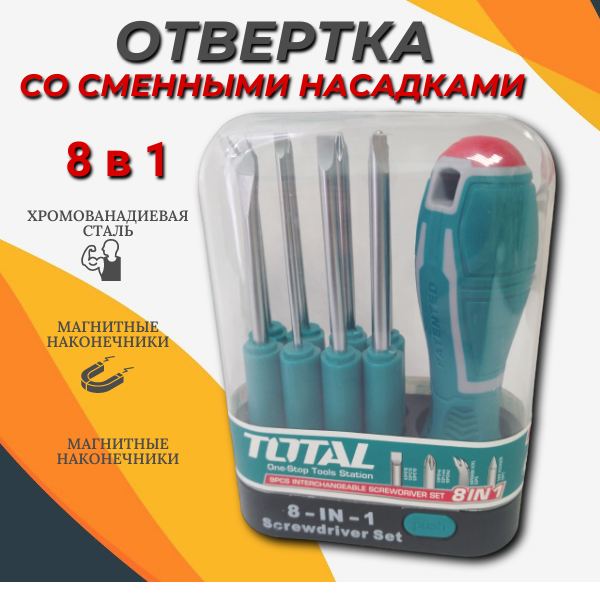 - Отвертка со сменными насадками TOTAL - 8 в 1. Модель THT250906