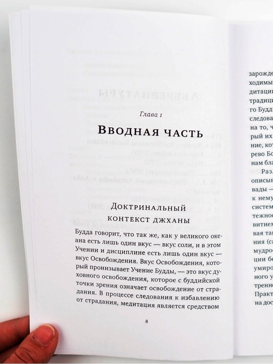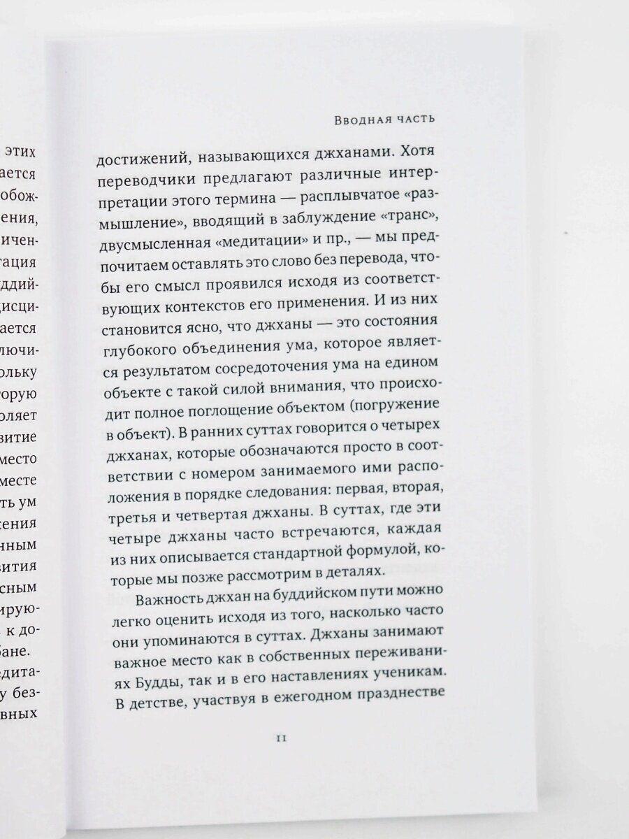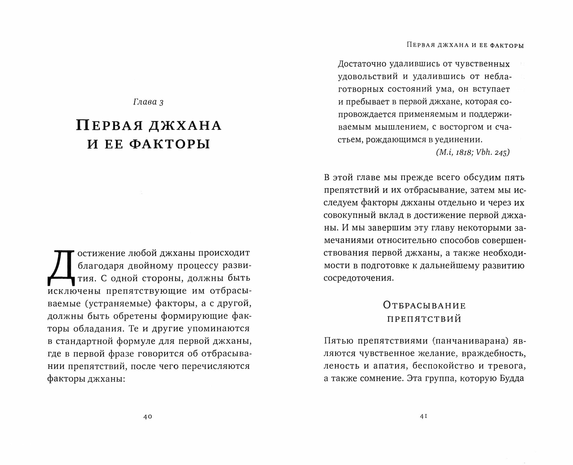 Книга посвящена рассмотрению природы джхан - состояний глубокого медитативного погружения, характеризуемого отстраненностью от беспокойств и завес мира чувственных желаний. В книге особый упор делается на ясное различение мирских и сверхмирских джхан. Так, четыре джханы и четыре нематериальных достижения вначале появляются как мирские состояния глубокой безмятежности, помогающие сформировать необходимую для возникновения мудрости основу сосредоточения. Но когда джханы непосредственно связаны с освобождающей мудростью, они называются надмирскими, запредельными джханами, объектом созерцания в которых является сама ниббана.