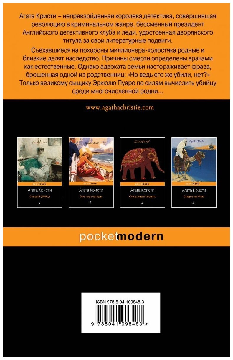 Съехавшиеся на похороны миллионера-холостяка родные и близкие делят наследство. Причины смерти определены врачами как естественные. Однако адвоката семьи настораживает фраза, брошенная одной из родственниц: Но ведь его же убили, нет?". А следующей ночью женщину, произнесшую эти слова, зверски убивают топором. Адвокат в замешательстве. Разумеется, ни о каком оглашении последней воли усопшего в такой ситуации не может быть и речи. Наконец, он приходит к выводу, что только великому сыщику Эркюлю Пуаро по силам вычислить убийцу среди многочисленной родни. "