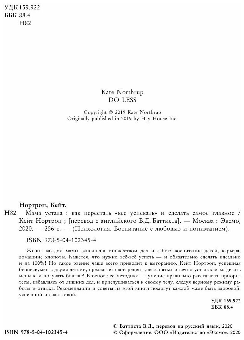 Жизнь каждой мамы заполнена множеством дел и забот: воспитание детей, карьера, домашние хлопоты. Кажется, что нужно все-все успеть - и обязательно сделать идеально и на 100 %! Но такое рвение чаще всего приводит к выгоранию. Кейт Нортроп, успешная бизнесвумен с двумя детьми, предлагает свой рецепт для занятых и вечно усталых мам: делать меньше и получать больше! В основе ее методики - умение правильно расставлять приоритеты, избавляясь от лишних дел, и прислушиваться к своему телу, следуя верному режиму работы и отдыха. Рекомендации и советы из этой книги помогут каждой маме быть здоровой, успешной и счастливой.