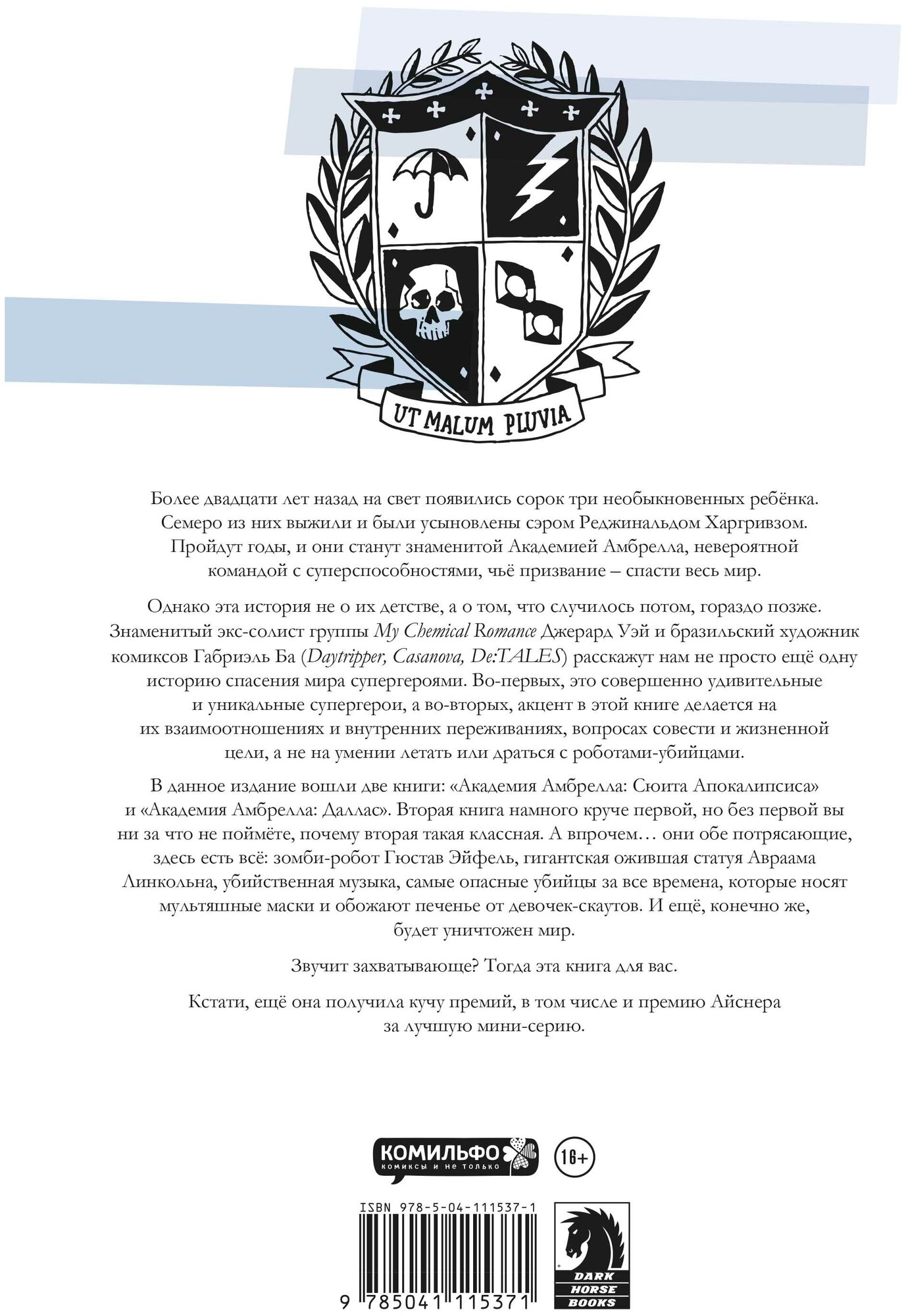 В данное издание вошли две книги: "Академия Амбрелла: Сюита Апокалипсиса" и "Академия Амбрелла: Даллас". Вторая книга намного круче первой, но без первой вы ни за что не поймёте, почему вторая такая классная. А впрочем… они обе потрясающие, здесь есть всё: зомби-робот Гюстав Эйфель, гигантская ожившая статуя Авраама Линкольна, убийственная музыка, самые опасные убийцы за все времена, которые носят мультяшные маски и обожают печенье от девочек-скаутов. И ещё, конечно же, будет уничтожен мир.