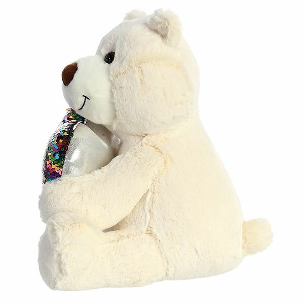 Плюшевый медведь кремового цвета с белой мордочкой, круглыми карими глазами и коричневым мягким носом. Игрушка в сидячей позе, держит в лапах большое сердечко в блестящих пайетках. Если провести рукой против направления пайеток, они изменяют цвет. Размер игрушки 30 см.