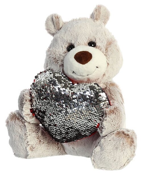 Плюшевый медведь светло-коричневого цвета с белой мордочкой, круглыми карими глазами и коричневым мягким носом. Игрушка в сидячей позе, держит в лапах большое сердечко в блестящих красных пайетках. Если провести рукой против направления пайеток, они изменяют цвет. Размер игрушки 30 см.