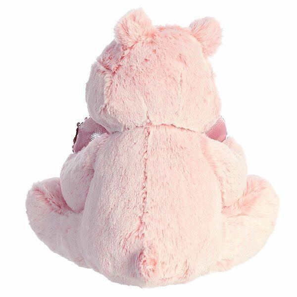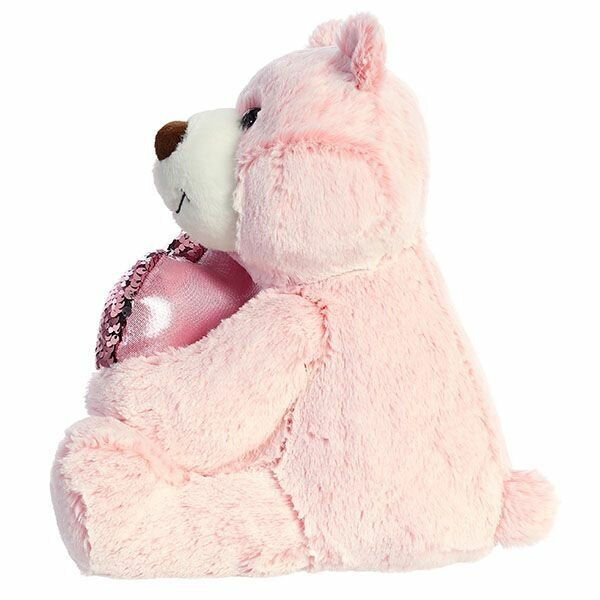 Плюшевый медведь розового цвета с белой мордочкой, круглыми карими глазами и коричневым мягким носом. Игрушка в сидячей позе, держит в лапах большое сердечко в блестящих пайетках. Если провести рукой против направления пайеток, они изменяют цвет на серый. Размер игрушки 30 см.