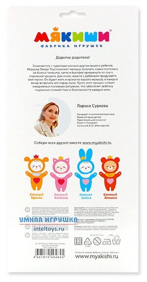 Sleepy Toys — лучшая игрушка для сладких снов в помощь маме! В красочной упаковке вы найдете книжку со сказкой-минуткой в подарок. Разработана специально для крепких снов наших малышей! Серия Sleepy Toys создана при участии популярного детского психолога Ларисы Сурковой: кандидата психологических наук, мамы пятерых детей, автора 16 книг-бестселлеров. Sleepy Toys поможет малышу: засыпать самостоятельно, не бояться темноты, легче и быстрее привыкнуть ко сну в отдельной кровати. Засыпать с любимой игрушкой из серии Sleepy Toys теперь любимый ритуал во многих семьях! Сонный Мишка живет в кроватке, и каждый вечер ждет своего маленького хозяина.Почему сотни мам выбирают Sleepy Toys? Российская игрушка. Без лишних деталей и звуков. В комплекте книжка сказка-минутка. Самое главное, сделано с любовью. Придумайте имя Мишке, и он станет самой любимой сонной игрушкой вашего малыша! Размер игрушки: 18х28х5,5 см.