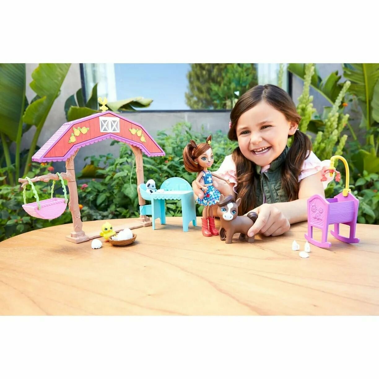 | Комплектация | 1 игровой набор; 1 кукла; 4 фигурки питомцев; 1 кроватка; 1 колыбелька; 3 бутылочки; 1 подгузник; 1 нагрудник; 1 гнездо; 3 яйца |
